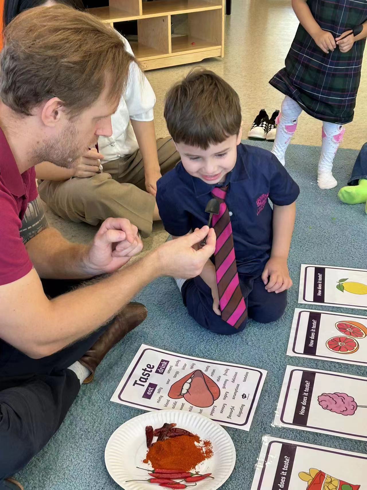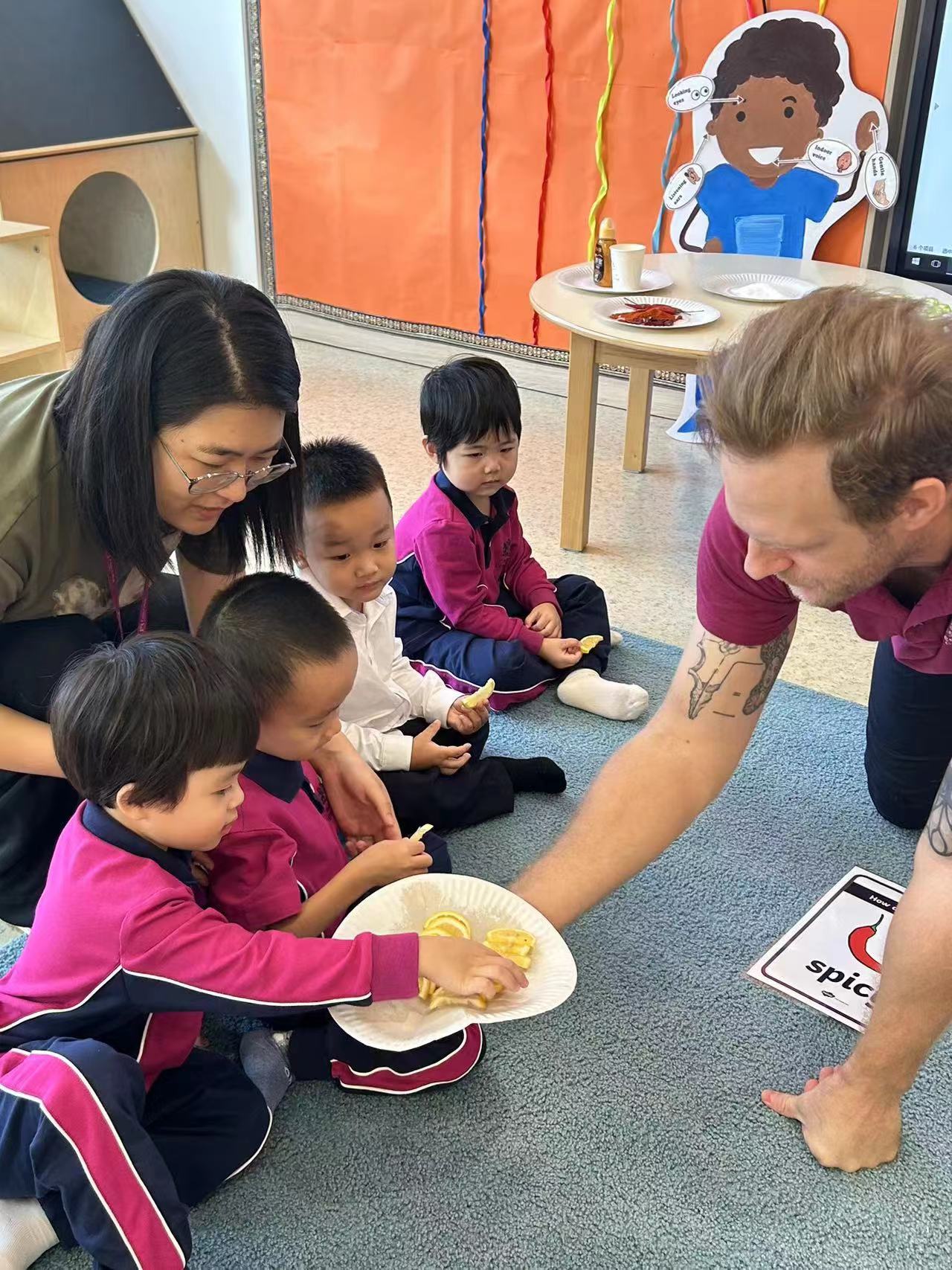 During our engaging circle time session, we explored the intriguing realm of taste sensation. To foster a hands-on experience, we organised a captivating food tasting activity. It was fascinating to witness the children's varied preferences and discernments regarding different tastes. Some of them even attempted to draw comparisons between the novel flavours and the familiar foods they regularly consume. One particularly noteworthy observation emerged: the children recognised the taste of salt, associating it with their home-cooked meals, suggesting that salt is a common ingredient in their household cuisine.