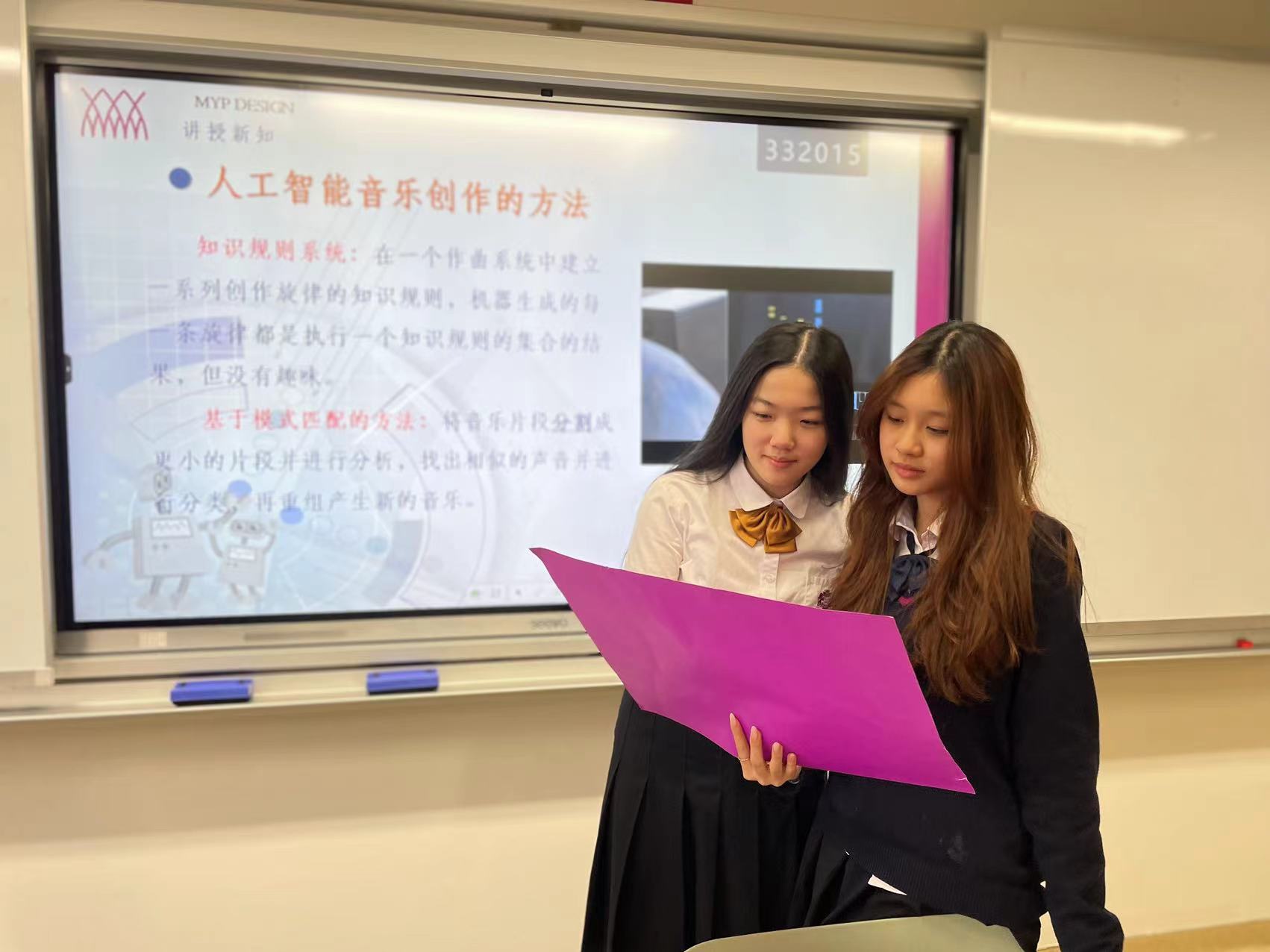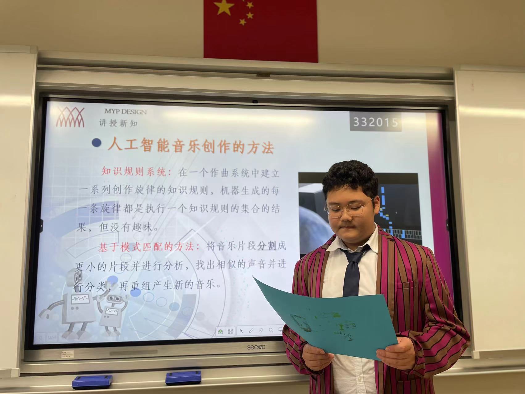 在八年级的设计课中,学生们踏上了一段多元化智能音乐创作的旅程,师生共同探究人工智能创作音乐的基本方法,在本单元的学习旅程中,同学们开始尝试运用人工智能辅助方式创作音乐曲目。“哇,这样谱写曲子的效率非常高,彷佛我也成为了音乐家。”沉浸在制作自己的音乐作品中,学生们开启了无限创造的可能性。在项目式学习的成果中,同学们开始释放想象力,集合AI生成技术进行了音乐和图像的创作,完成在线音乐博主的项目。