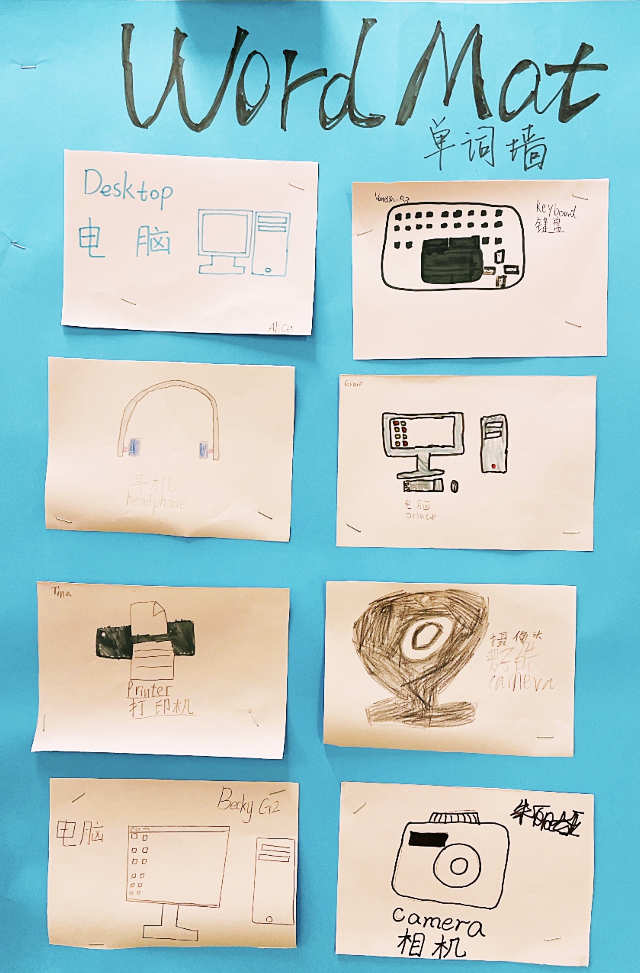 在沉浸式双语学习环境中,我们使用词汇墙帮助学生学习并理解信息和科技领域的专业术语。这些词汇墙展示的单词卡清晰地表达了关键词汇的含义。词汇墙的制作充分发挥了学习者的能动性,它具有生动的视觉效果,协作建设词汇墙的学习体验强化了学生们对于学科术语的理解并提升了对信息科技学科的学习积极性。
