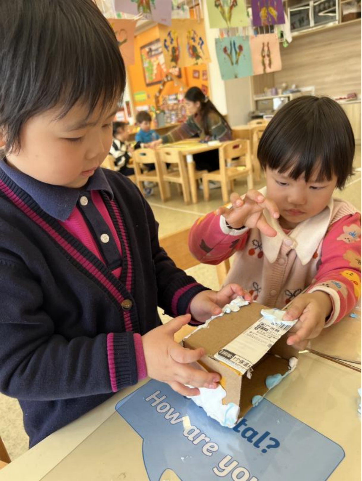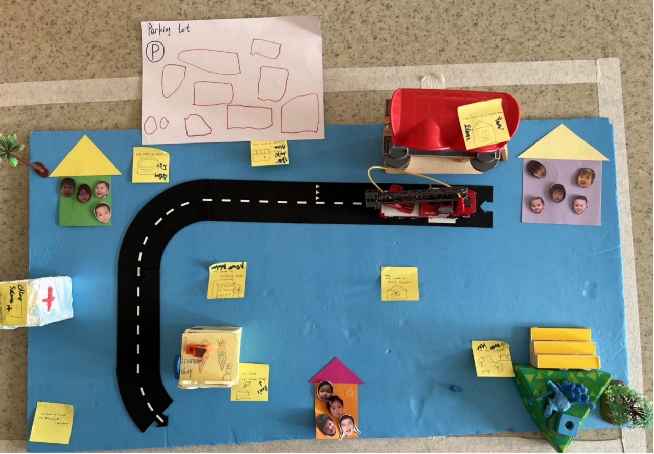 孩子们动手建立了一个社区模型,并一起讨论了社区中的组成部分。孩子们想到了学校、医院、消防站、警察局、购物中心、公园等建筑和公共设施,并自主选择材料动手创建社区模型,最后尝试在社区中搭建道路将各个功能区域连接起来。