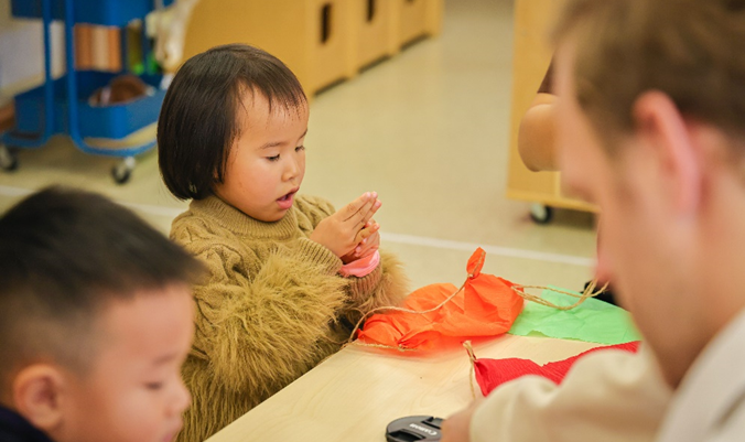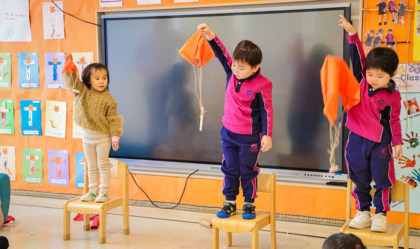 我们分享了制作降落伞的方法,通过降落伞降落试验的小组活动,孩子们观察到降落伞下降速度和它的大小以及自身重量之间的关系。随后孩子们自己制作了降落伞,大部分孩子都选择了制作较大的降落伞,因为根据他们的观察,较大的降落伞减速效果更好。制作完成后,孩子们在室外进行了降落伞飞行测试。
