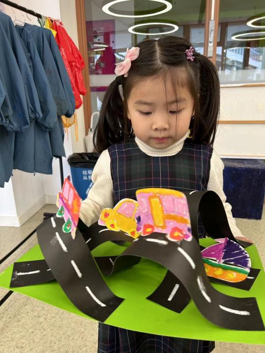 孩子们通过剪纸、涂色和粘贴等技巧进行了交通系统的创作,设计并构建了一幅立体的公路场景。