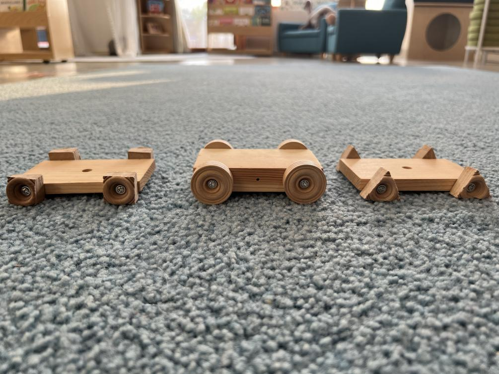 我们制作了三角形、正方形和圆形三种不同车轮形状的汽车模型。通过观察和感受汽车模型从斜坡上行驶下来,孩子们得出结论:三角形的车轮因其大面积的平坦表面只能滑动;正方形的车轮会导致行驶颠簸;圆形车轮运行距离最远且最平稳。