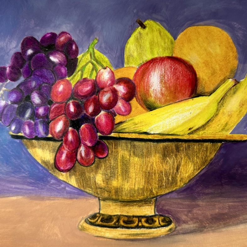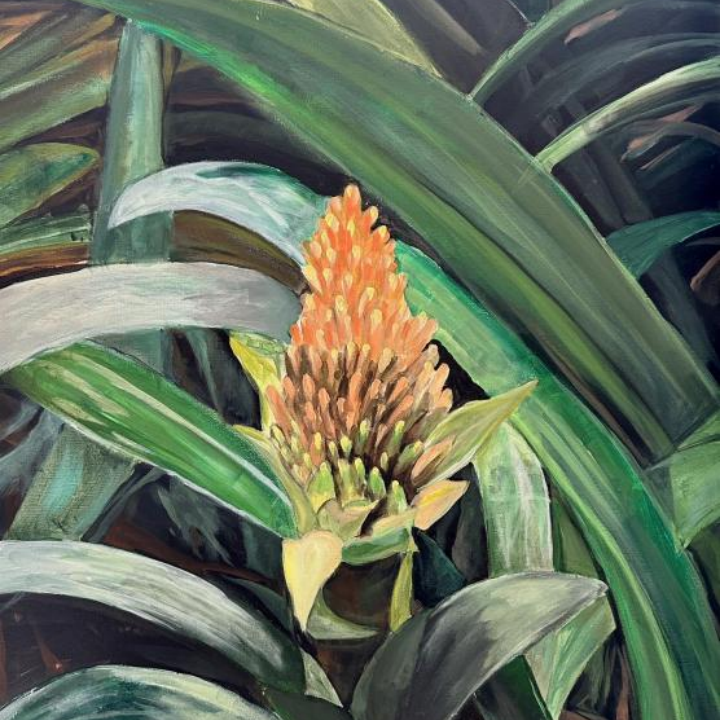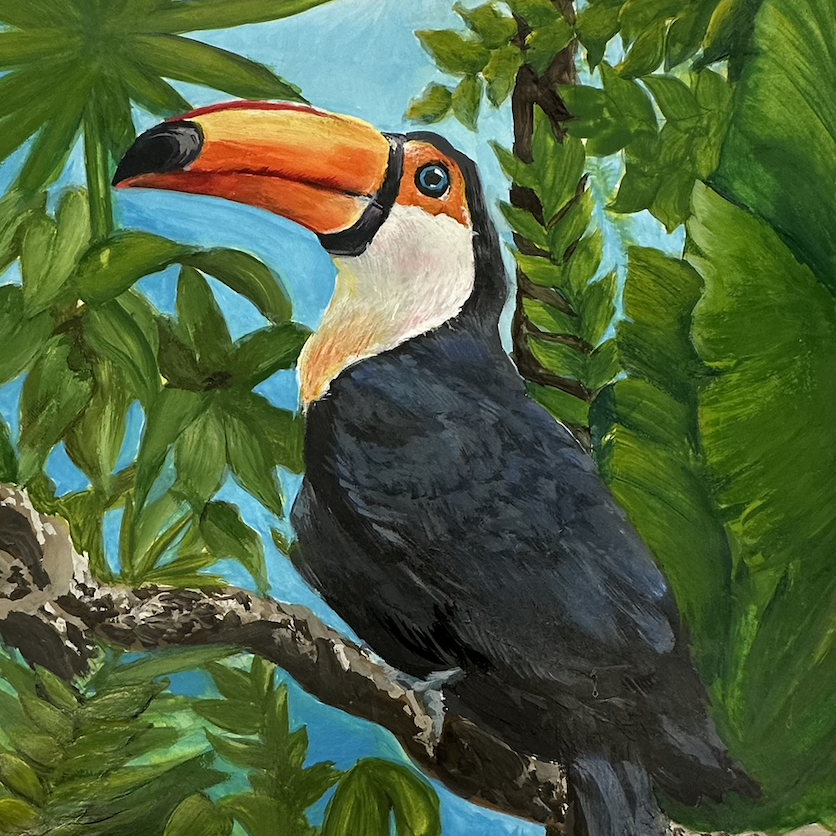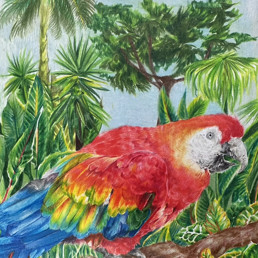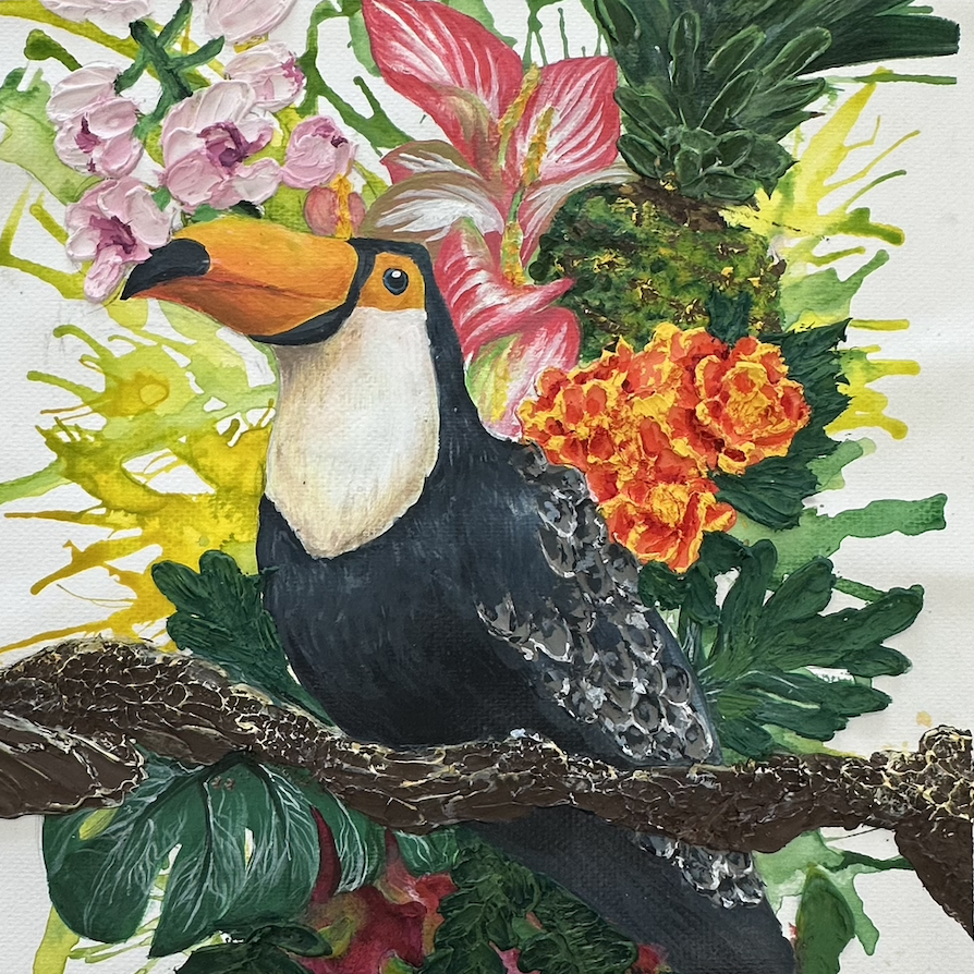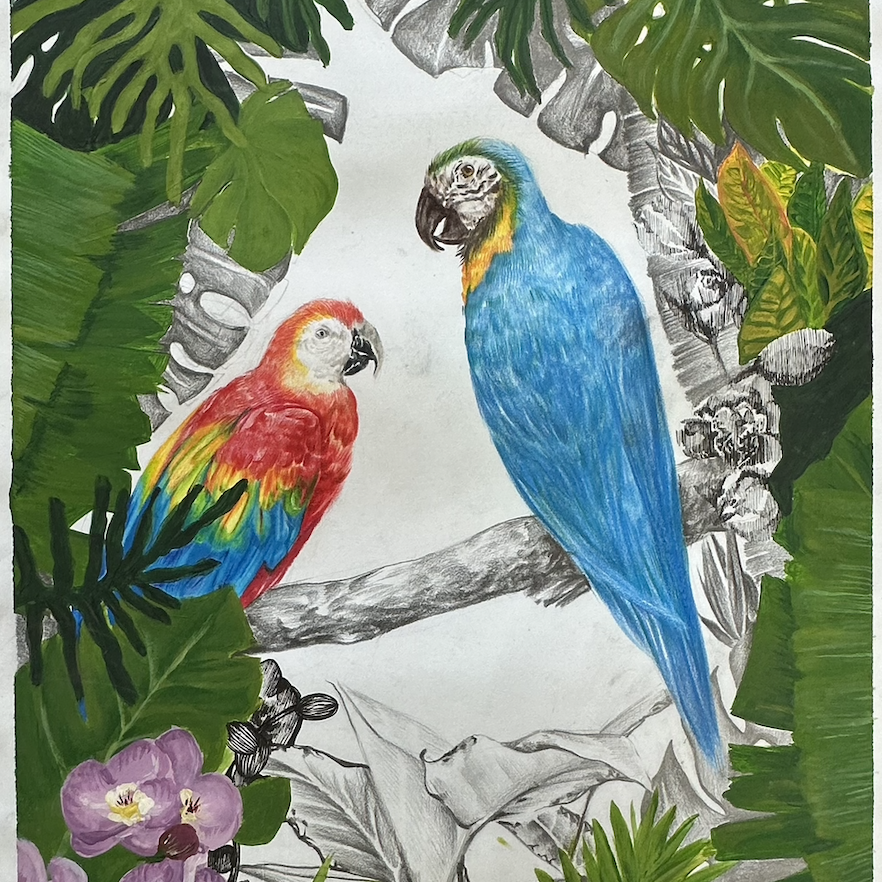 Amy选择了“热带雨林中的鸟类”这一主题,她的灵感来源于斐特思校园内五彩缤纷的植物。她深入研究叶子的颜色、细节和纹理,以及生活在其中的一些动物。她的照片来自一次动物园之旅,她的构图是将不同种类的植物和鸟类排列在一起。Amy一直在不断挑战自己,尝试亨利·卢梭和卡尔·布伦德斯截然不同的绘画风格,其中一位以高度写实的图像而闻名,另一位则是以抽象的后印象派而闻名。Amy从这两位艺术家身上汲取灵感,将卢梭大胆的色彩运用与布伦德斯高度细腻的写实手法结合。她的最终作品探索了一系列构图和混合媒介,并提供了许多隐藏的细节供观众在观看她的艺术作品时探索。