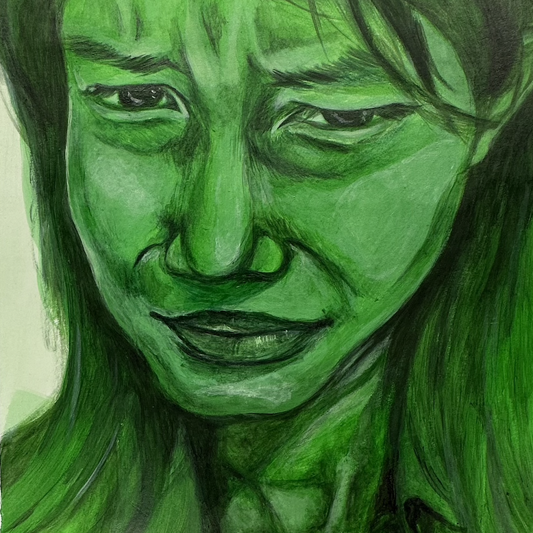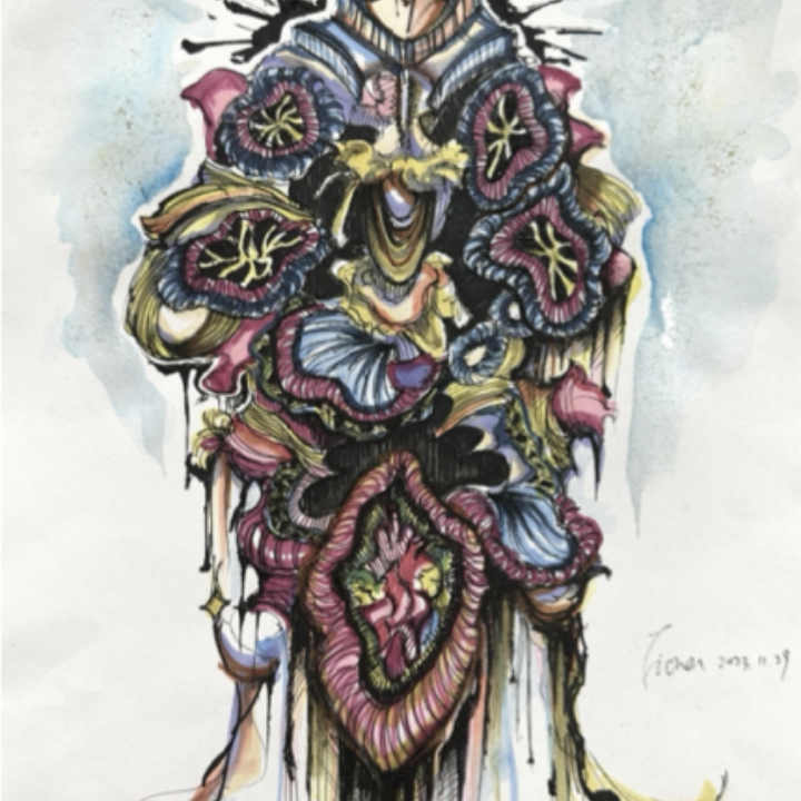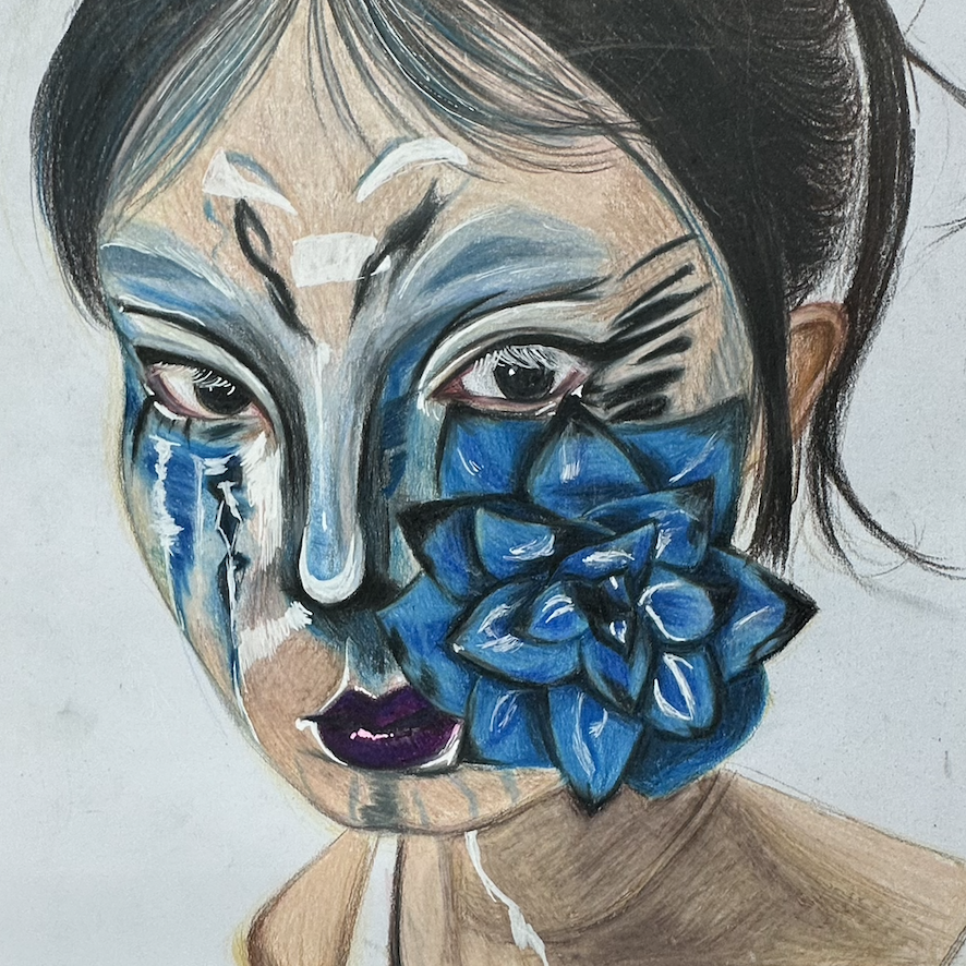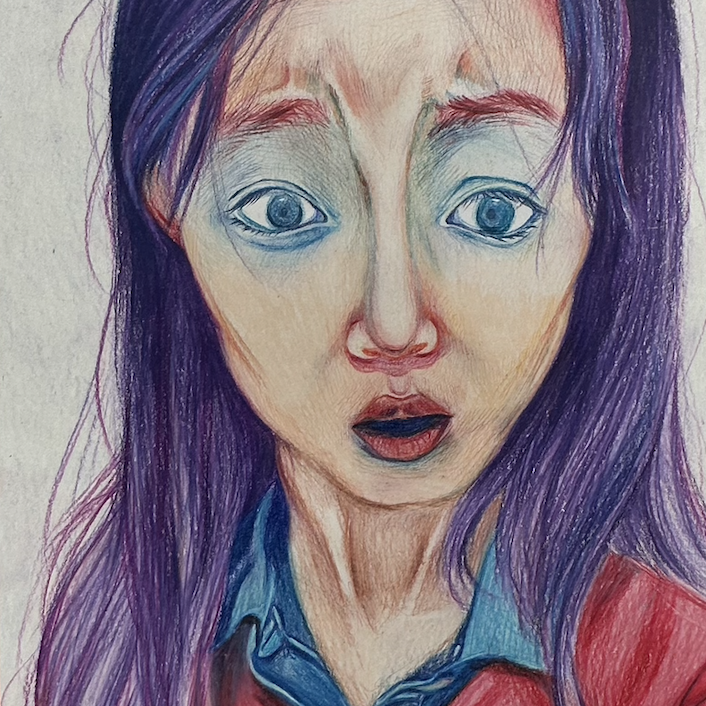 Orchid在开始研究“情绪”时,拍摄了几张自画像,展示了从沮丧到欣喜以及介于两者之间的各种面部表情。她借鉴了自己的戏剧和舞台经验,其中面部表情是向观众传达信息的关键组成部分。她在课程作业中描述,情绪是人类的一种体验,它将我们所有人联系在一起,了解这些特征有助于我们更深入地相互联系。Orchid研究了艺术家爱德华·蒙克(Edvard Munch)和阿法林·萨杰迪(Afarin Sajedi),以在情绪主题中将风格和隐喻与历史联系起来。她将蒙克流畅的动作和色彩的运用、萨耶迪对日常物品的隐喻性运用以及受意大利文艺复兴启发而对主题进行高度细致、凝视融入到自己的艺术中。 Orchid的最终作品是她的实验、研究和学习的成功结合,展示了她的能力和思维的巨大进步。