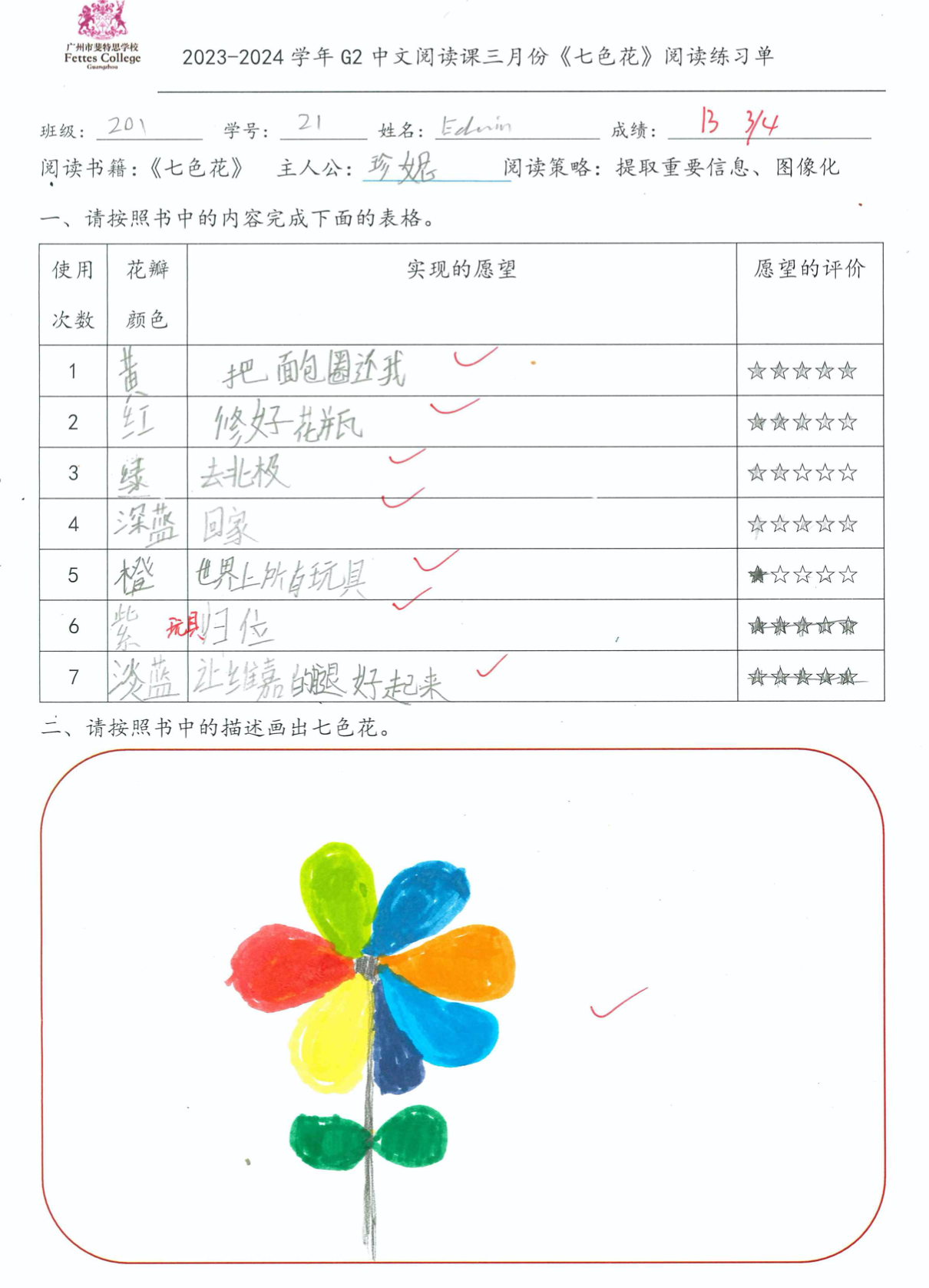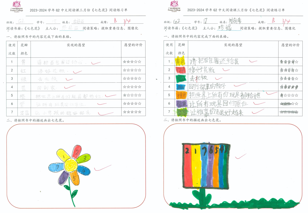“鸟欲高飞先振翅,人求上进先读书。”阅读能力是孩子学习语言的核心能力,具有举足轻重的地位。三月份的班级共读书目是《七色花》,通过导读课、阅读策略课、图书馆指导课等,孩子们了解了这本书的基本信息,学习了“图像化”等阅读策略,也在图书馆感受到了中文阅读的乐趣。