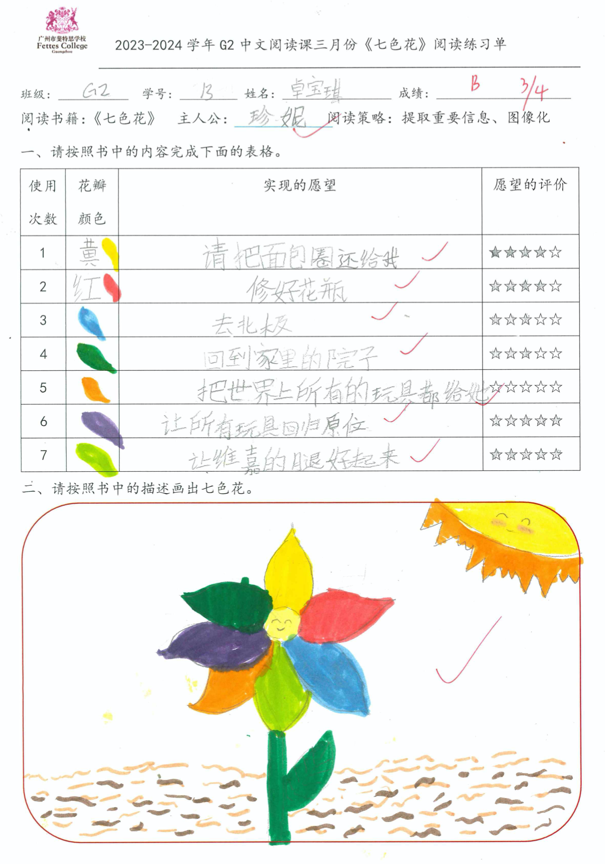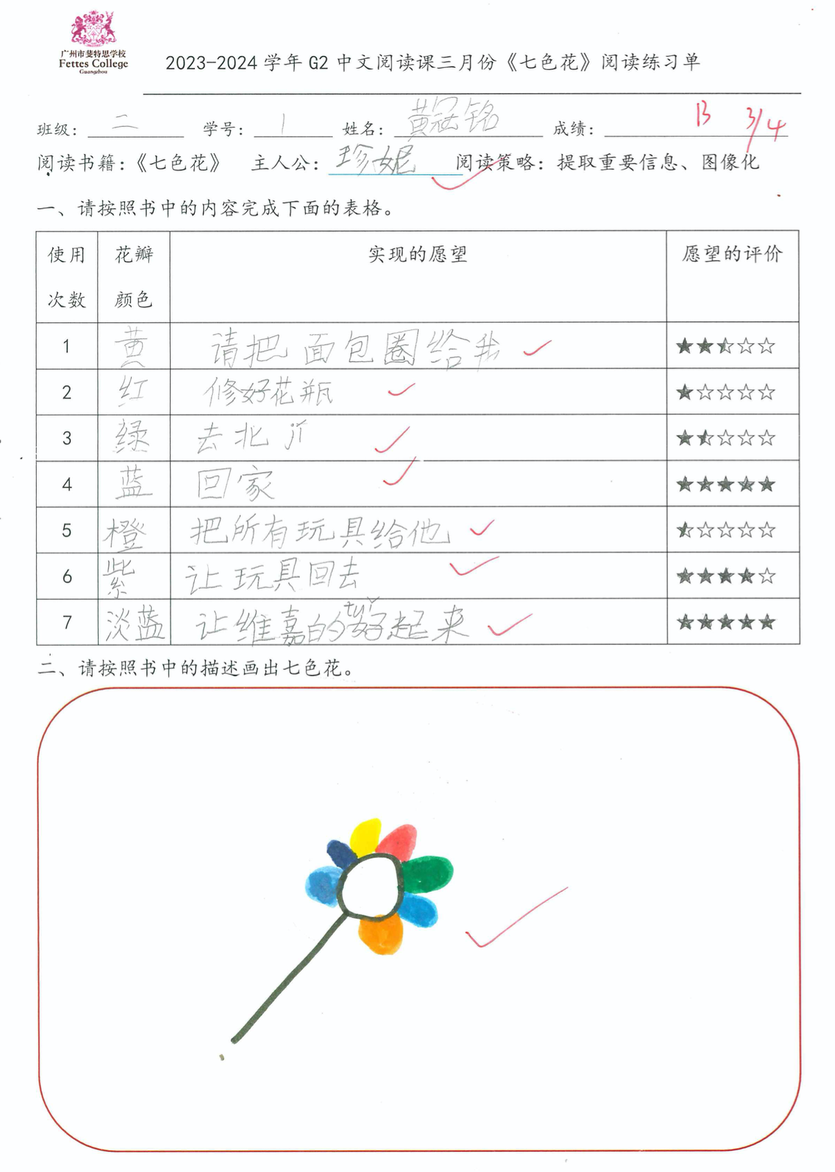 "Before a bird soars high, it must first flap its wings; before a person seeks progress, they must read." Reading ability is a fundamental skill for children's language learning and holds great importance. The book selected for the class to read in March is "The Seven-Coloured Flower." Through introductory lessons, reading strategy lessons, library guidance, and more, the children have understood the book's basic information. They have also learned reading strategies such as "visualisation" and experienced the joy of reading Chinese books in the library.