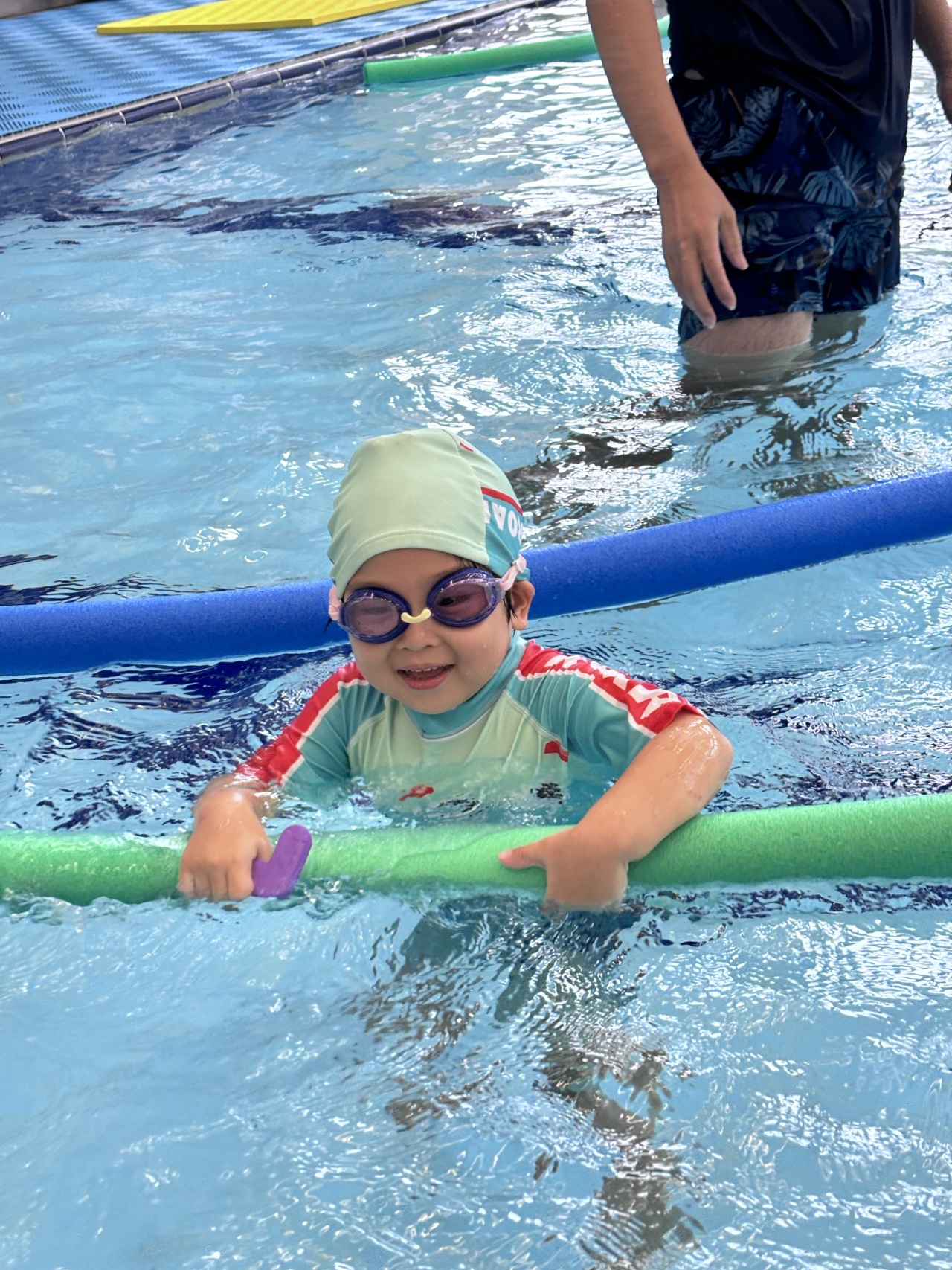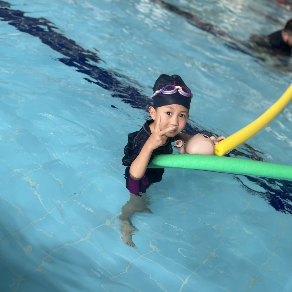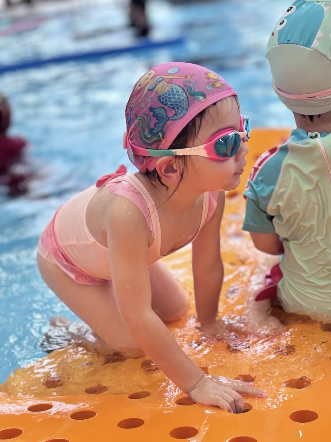 而对于小小班和小班的孩子们,他们同样展现出了非凡的勇气。在老师和同伴的陪伴下满怀好奇地踏入水池,开始了自己的水上探险。借助色彩鲜艳的泡沫条,他们尝试着在水上保持平衡,最终也能勇敢地尝试独立漂浮,享受水上世界的乐趣。