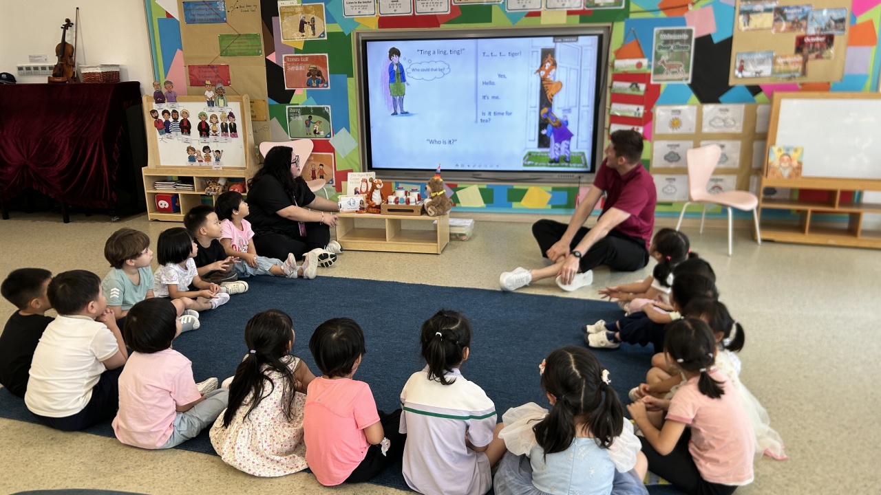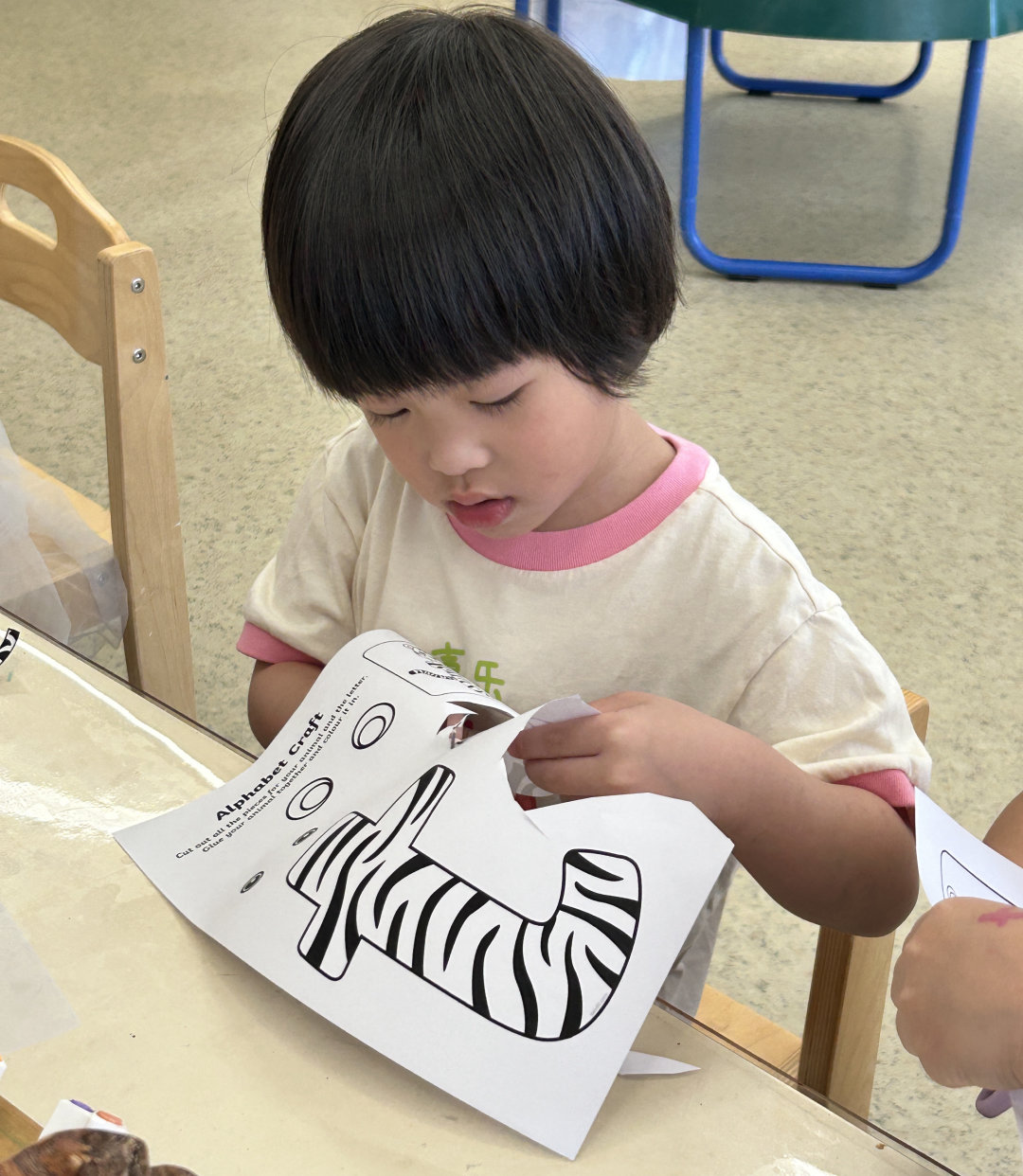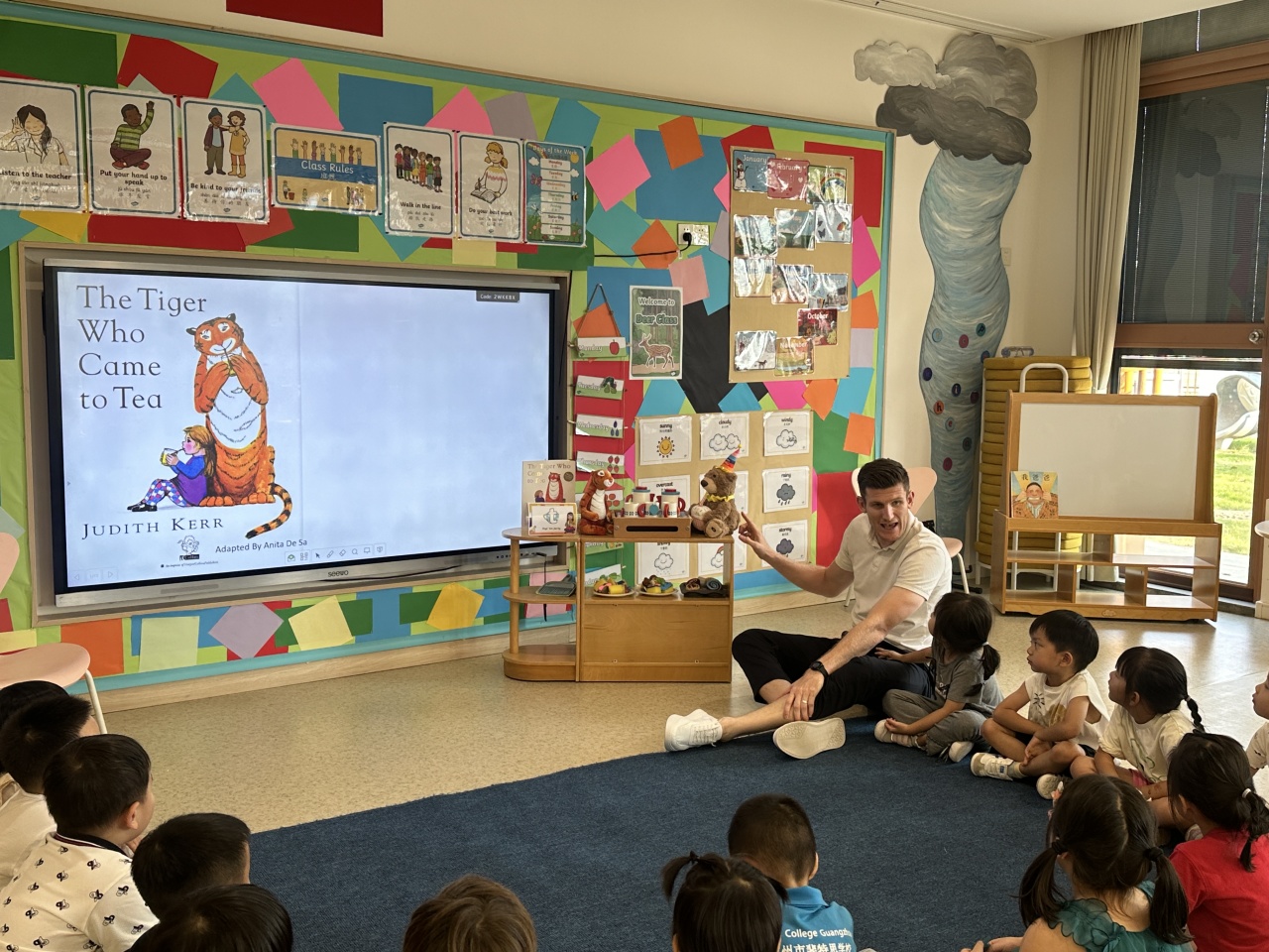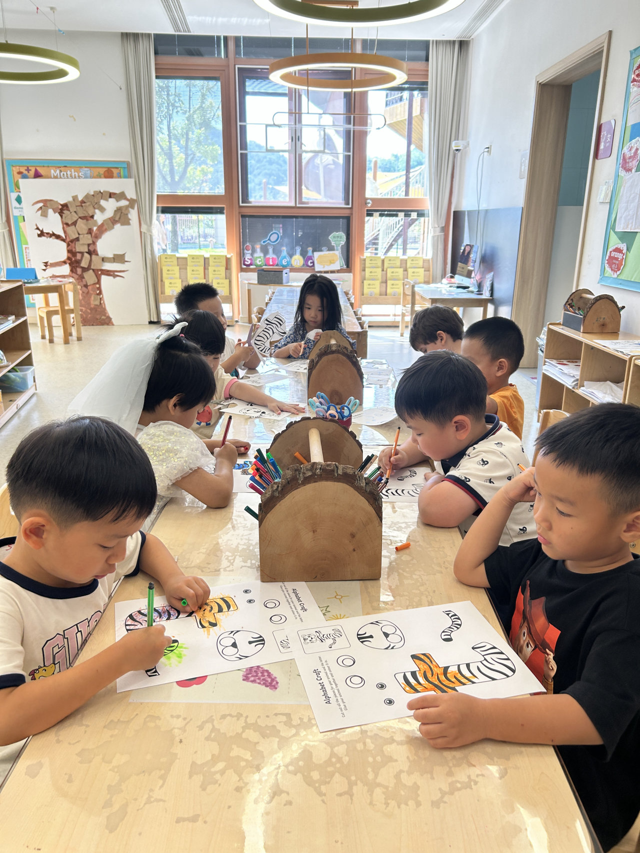 本周,中班的孩子们围绕着字母“T”展开了一系列有趣的活动。我们举行了一场特别的“茶会”,孩子们聚集在一起,听老师分享经典绘本《The Tiger Who Came to Tea》。这个故事生动有趣,也为孩子们展示了以“T”开头的单词一“Tiger”(老虎)、“Tea”(茶)和“Two”(二)。