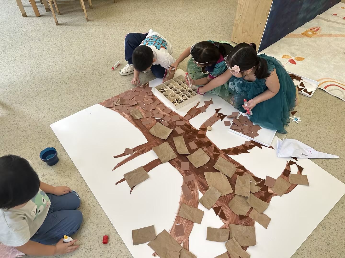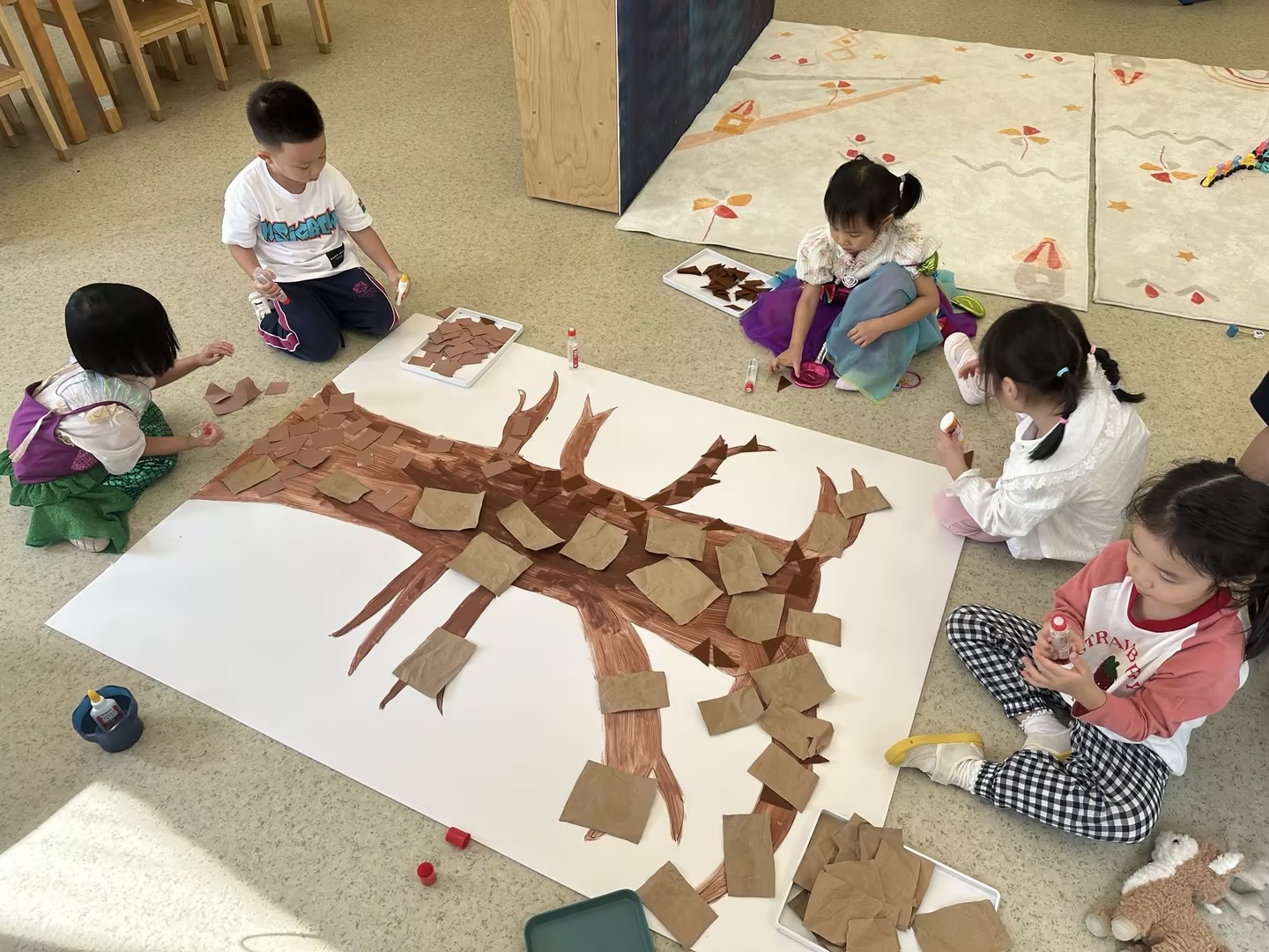 关于“tree”,孩子们共同合作,制作了一棵“家庭树”。每个孩子都将自己家庭成员的名字写在树叶上,并将这些“树叶”贴在大树的枝干上。制作家庭树的过程,孩子们不仅了解了各自的家庭,还进一步认识了家庭成员之间的关系。