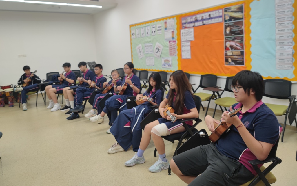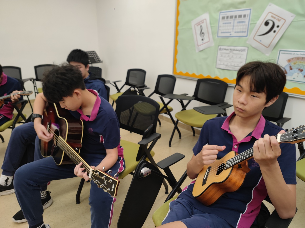 在八年级,学生们已经熟悉了基本的乐谱和管弦乐队的各种乐器。在练习尤克里里的过程中,学生们学习了乐器的第一个和弦,并通过团队合作进一步磨练了他们的毅力和协作能力。