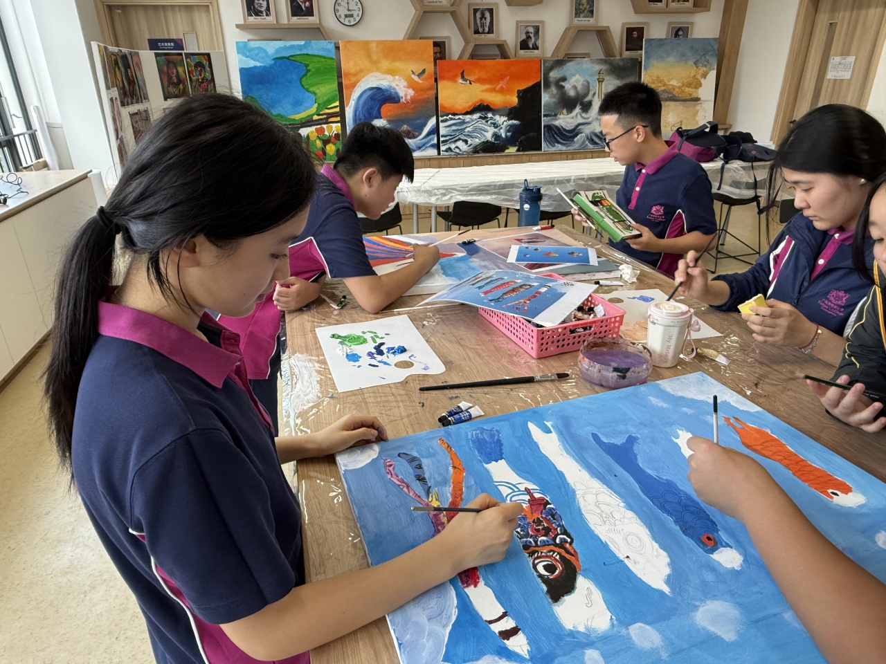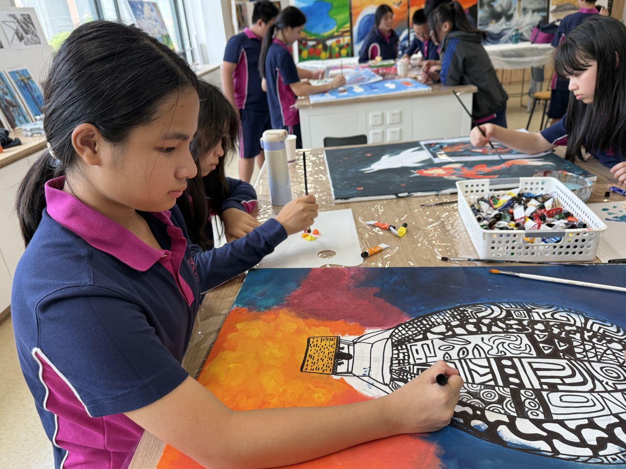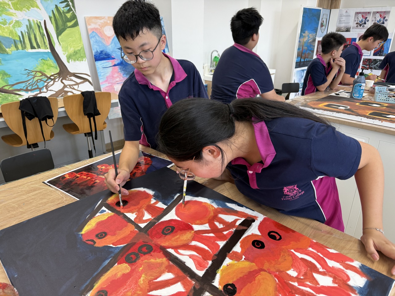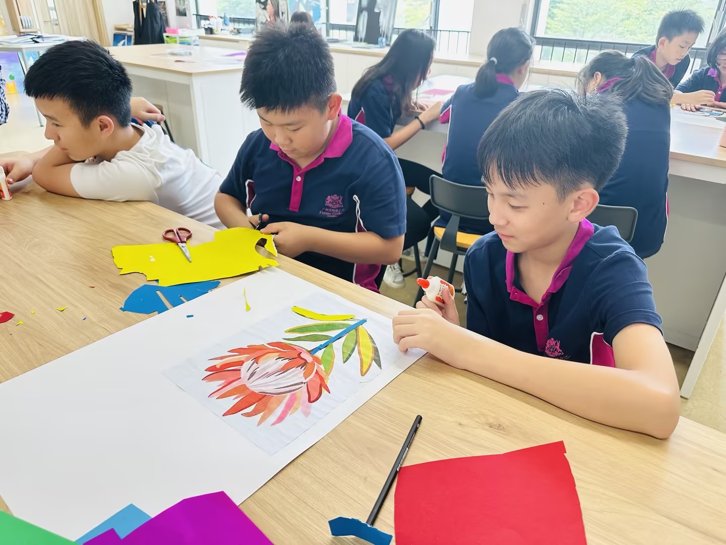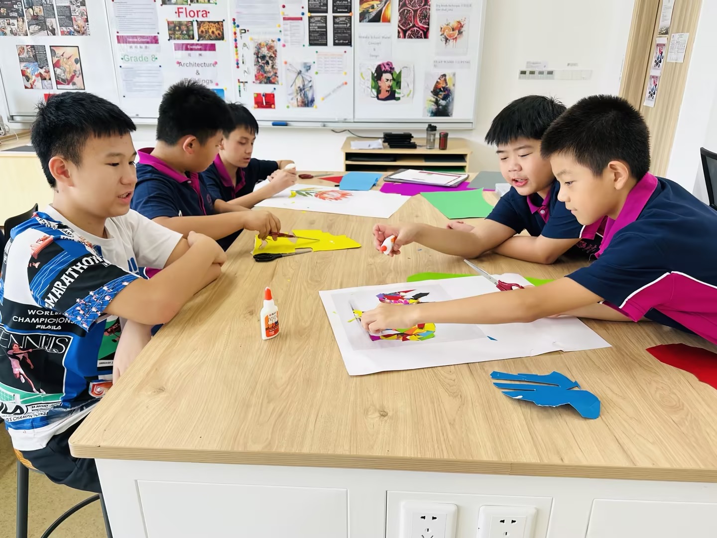 在广州斐特思的国际文化节上,六年级的学生们参与了一个充满活力的艺术项目,表达了他们对全球多样性的理解,创作出代表各国的动物和花卉。学生们积极合作,探索不同文化中独特的动植物,从它们独特的颜色、形状和象征意义中汲取灵感。每个小组都热情洋溢地设计了自己的作品,融入了反映他们所研究国家的传统艺术风格和材料。这项创意活动不仅提升了他们的艺术技能,还促进了对全球文化遗产的更深入理解和欣赏,最终在节日期间展现出了一幅幅美丽的作品,展示了他们的辛勤努力和创造力。