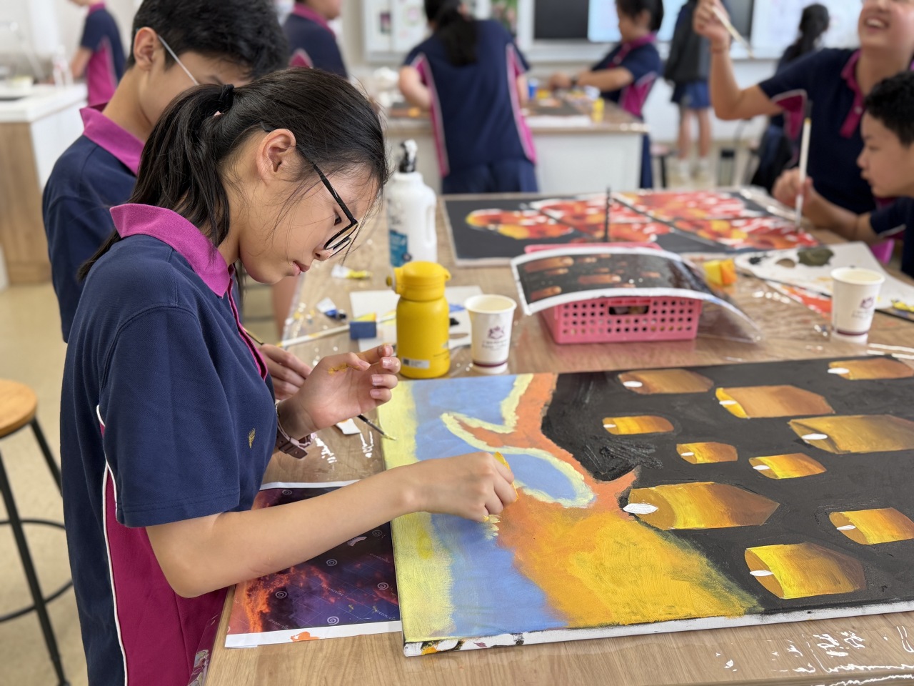 七年级的学生完成了一项名为“节日文化”的艺术项目。在这个项目中,他们学习了世界各地不同的文化,包括其传统、当地符号和庆祝方式。学生们以小组合作的方式,创作出艺术作品。这使他们能够分享想法、团队合作并发挥创造力。他们所完成的作品在国际文化节上展出,让观众们有机会通过艺术来了解全球文化。这个项目帮助学生们欣赏文化的多样性,表达自己,并将艺术与周围的世界联系起来。