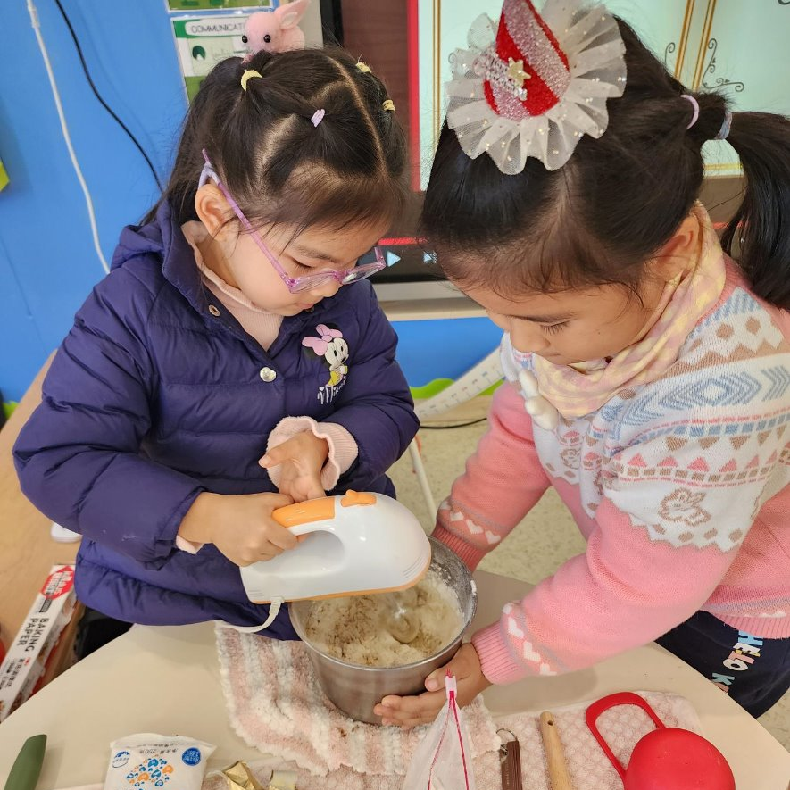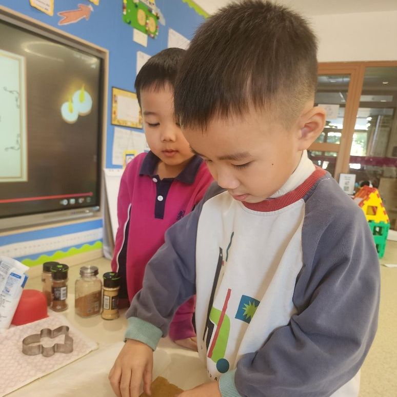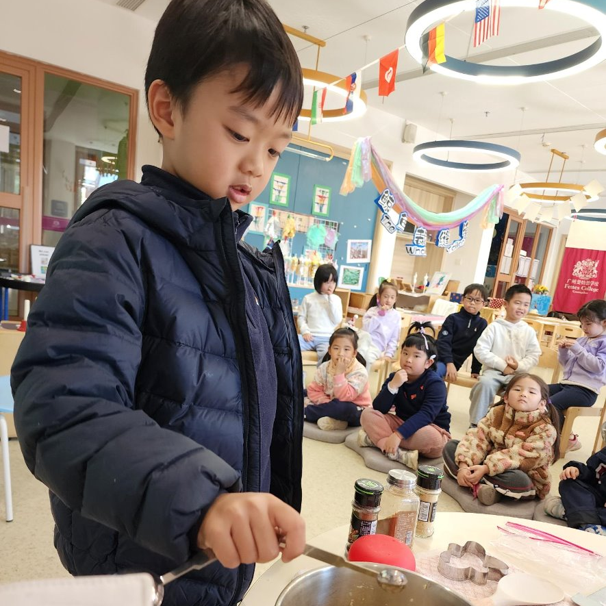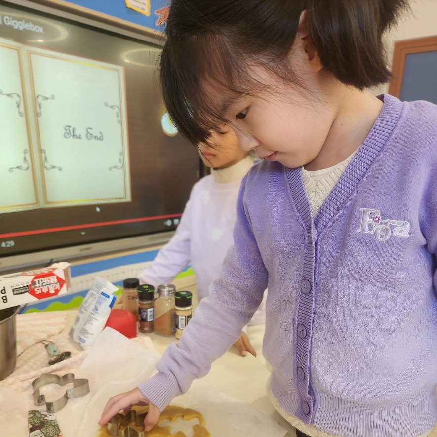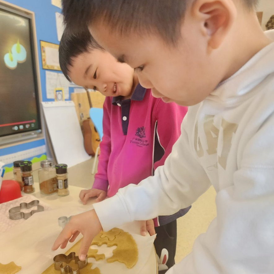 在暖冬日活动中,孩子们一同体验了制作姜饼人。他们混合材料、揉面团、擀面饼、切割形状、放入烤箱烘烤,感受着原材料变为美味饼干的神奇过程。教室里弥漫着姜饼的香甜气息,孩子们还将自己制作的姜饼人和买来的姜饼人做了对比,为自己也能生产“姜饼人”而自豪。