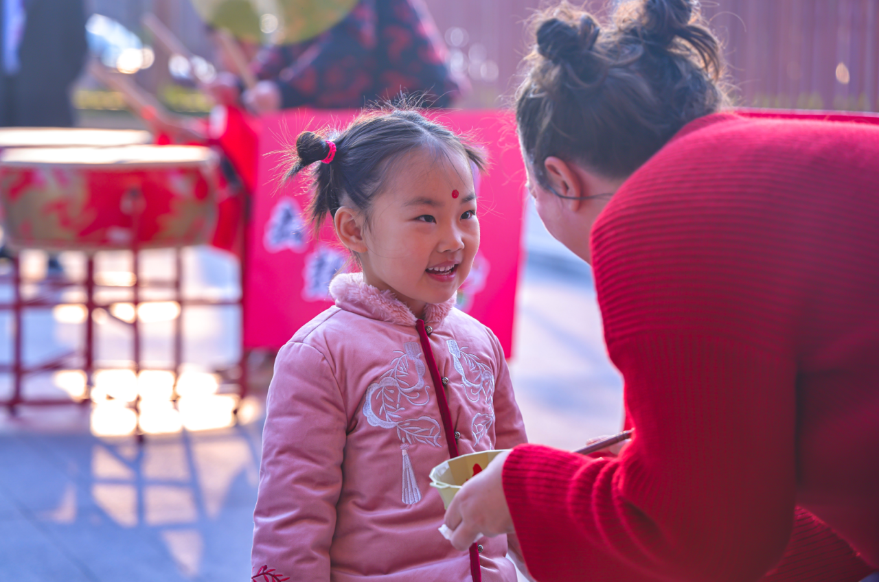 老师用朱砂在孩子们的眉心轻轻点上红点,寓意开启智慧,眼明心亮。孩子们感受到这独特的祝福。