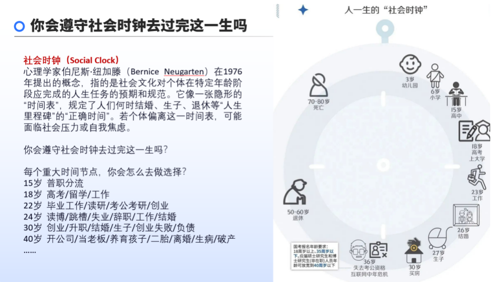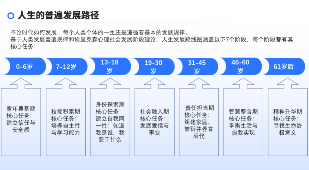 每个人的一生都遵循基本发展规律,从童年奠基期到精神升华期,每个阶段都有核心任务。社会时钟规定的“正确时间”并非人生标准答案。人生是不断做选择题的过程,没有绝对的“最优解”。考上名校、年薪百万、创业成功等,并非衡量成功人生的唯一标准。我们要引导孩子思考生活的意义,找到属于自己的“成功”定义。