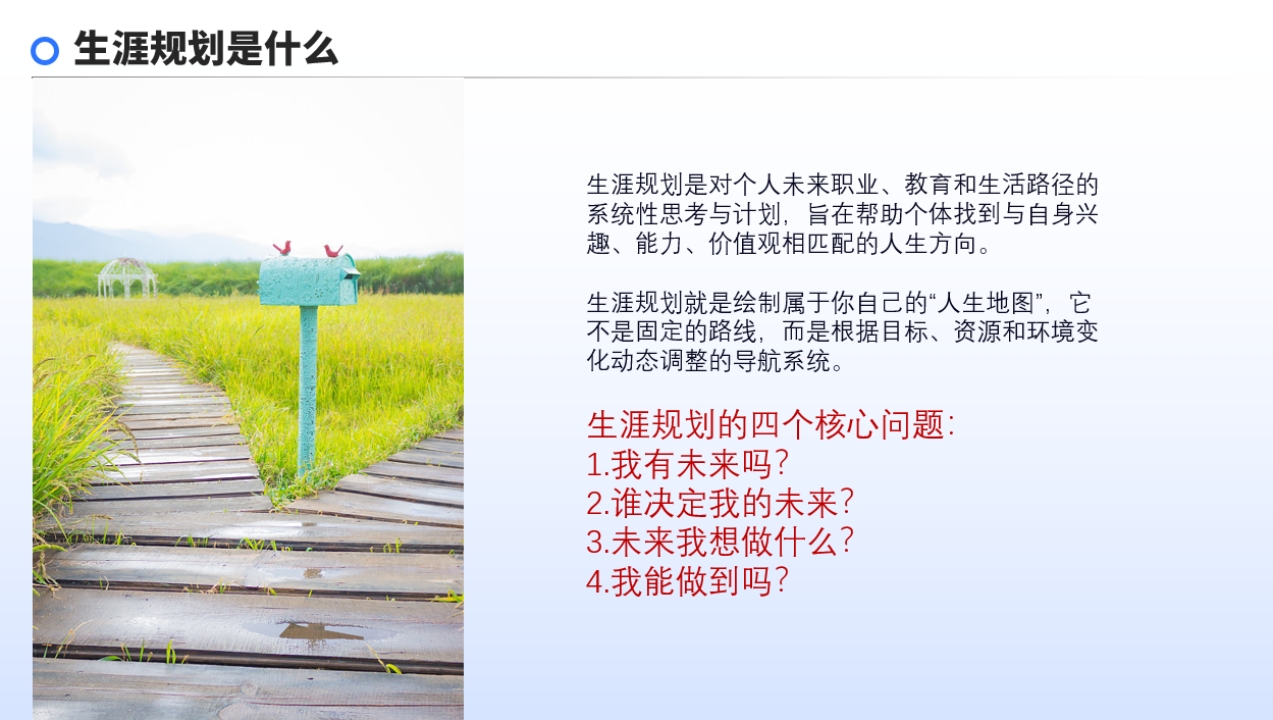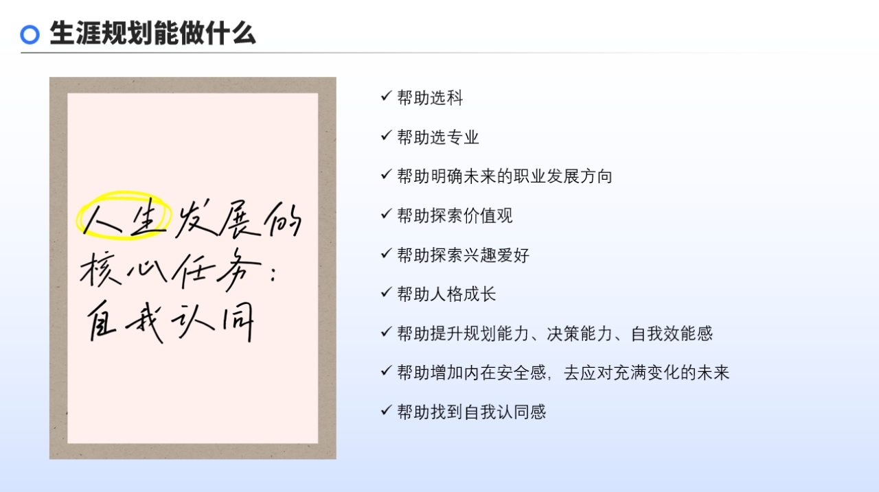 在不确定的未来中,生涯规划犹如一盏明灯。它是个人对未来职业、教育和生活路径的系统性思考与计划,能帮助孩子找到与自身兴趣、能力、价值观相匹配的人生方向。15-25岁是生涯发展关键期,选科、选专业、职业发展方向等选择,都与孩子的未来息息相关。通过生涯规划,孩子能更好地选科、选专业,明确职业方向,提升规划、决策能力和自我效能感,增加应对未来的安全感。
