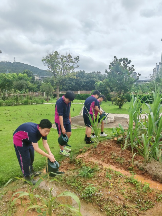 课堂上,同学们顶着骄阳,分组协作,有的挥锄翻土,有的筛选种子,有的疏通水渠,忙得热火朝天。在师生的共同努力下,大家学会了根据光照特点调整种植间距,掌握了高温天气下的科学浇水方法,还懂得了如何为幼苗巩固土基。汗水浸湿了校服,却挡不住大家的热情,分工合作中,彼此的默契悄然升温。