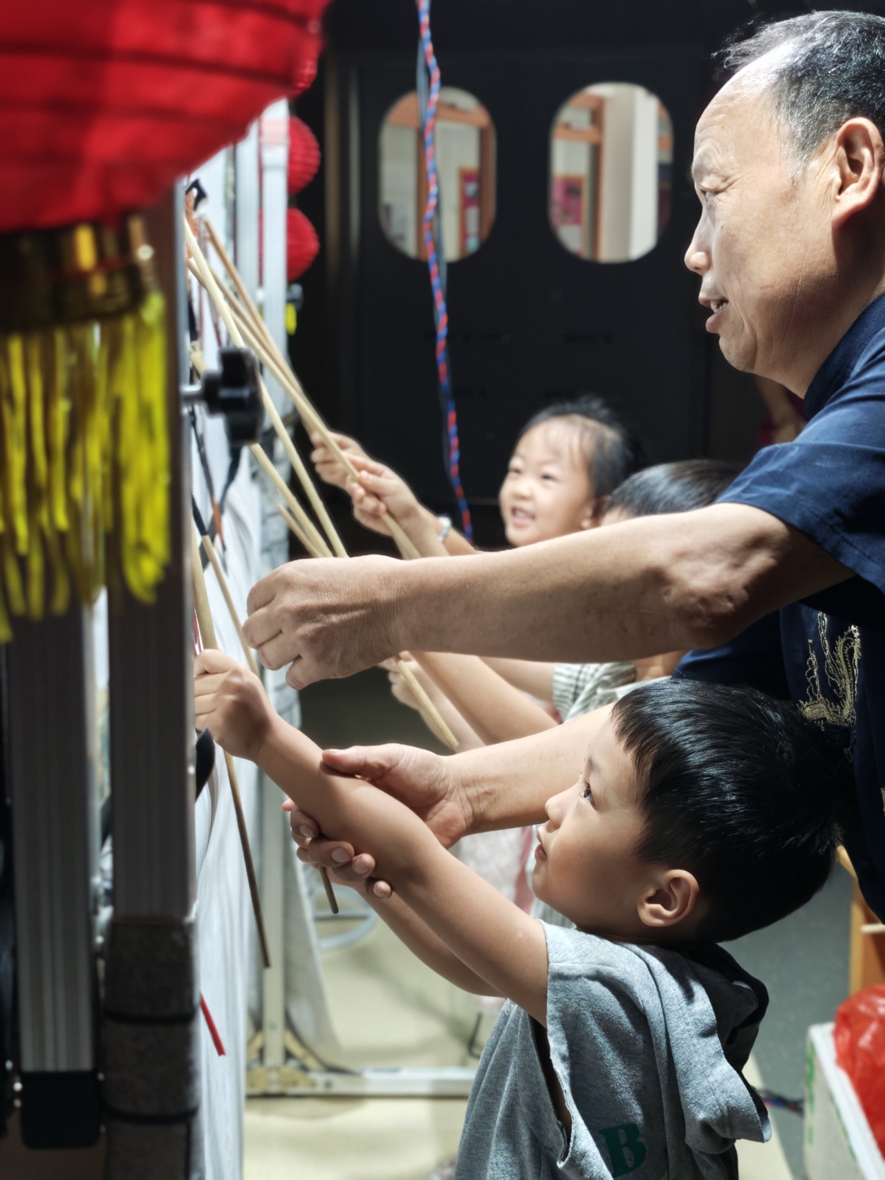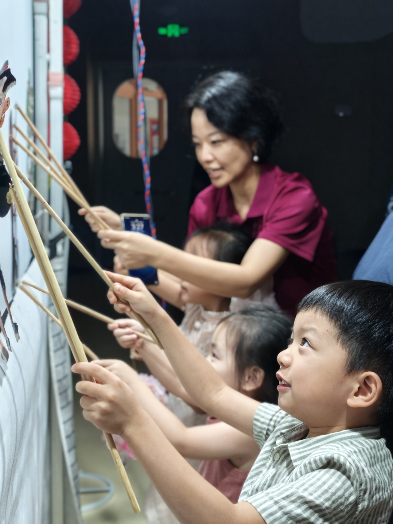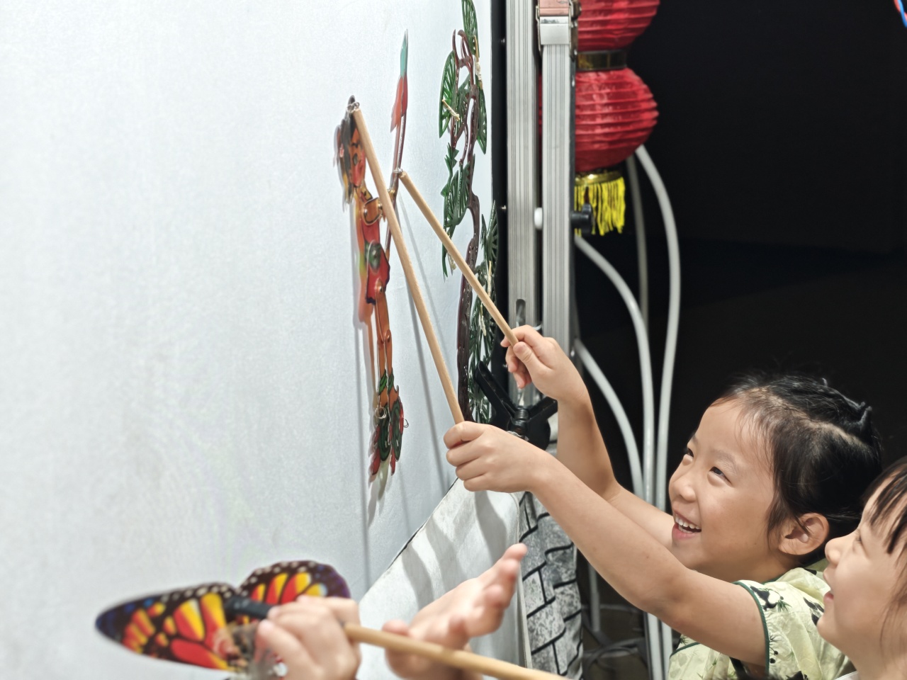 非物质文化遗产——皮影戏。《嫦娥奔月》《龟兔赛跑》等经典故事在光影间生动呈现,孩子们全神贯注,沉浸在传统文化的魅力中。互动环节更是让他们兴奋不已,亲手触摸并尝试操作皮影,近距离感受了这一古老艺术的灵动与神奇。