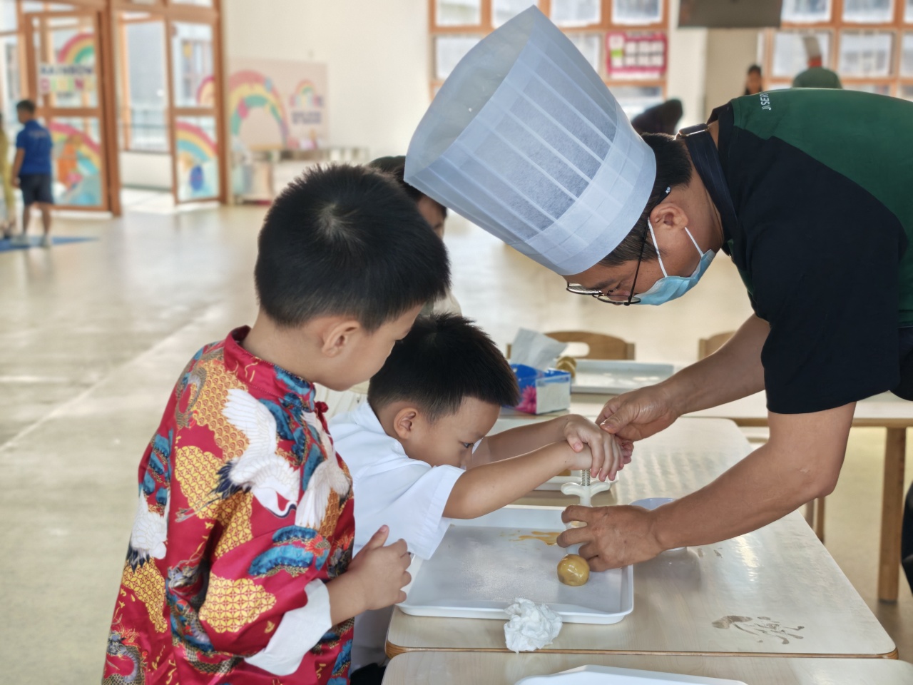 食堂的叔叔阿姨们作为特邀老师,带领孩子们体验了月饼制作的乐趣。从揉面、包馅到压模成形,孩子们在亲手实践中感知传统美食的制作过程,并将这份满载心意的甜蜜礼物带回家与亲人分享。