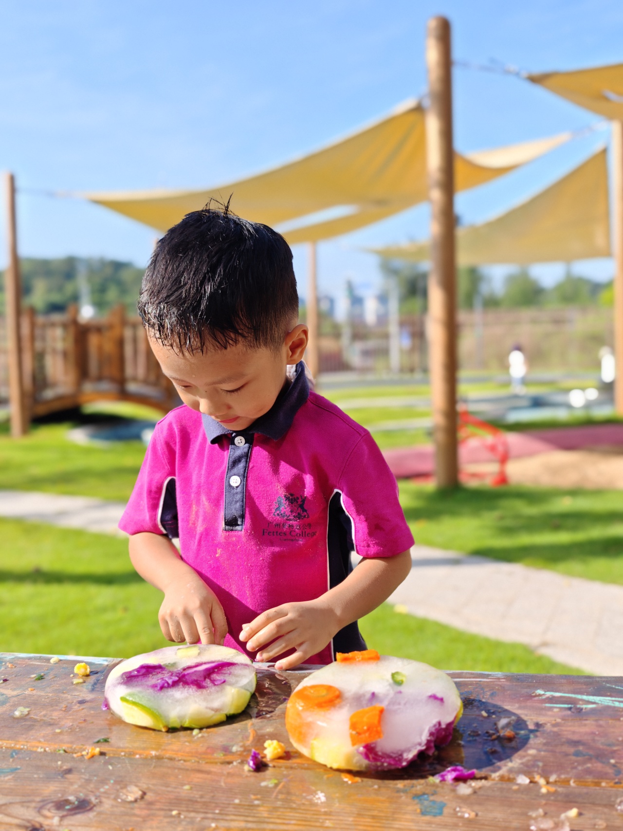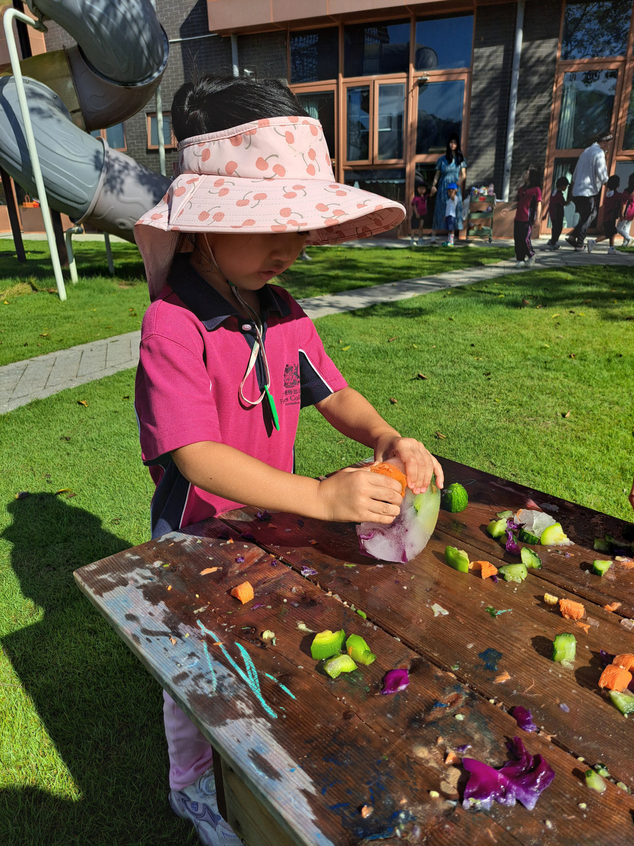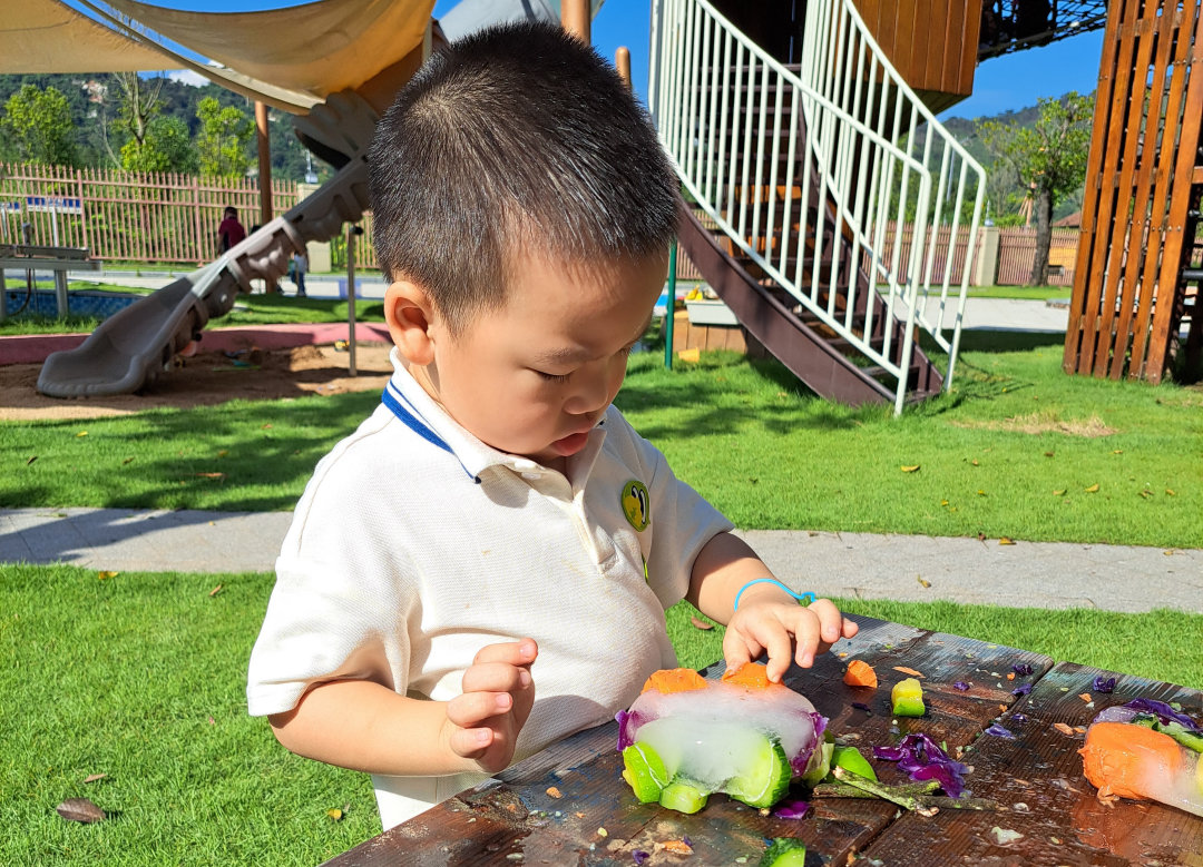 最后,我们把蔬菜冻进了冰块里。幼儿园的每个小朋友都探索了这些“冰封的宝藏”。摸一摸,冰块冷冰冰、硬邦邦,里面的蔬菜却变得软乎乎的。