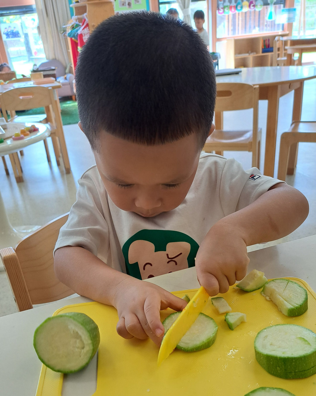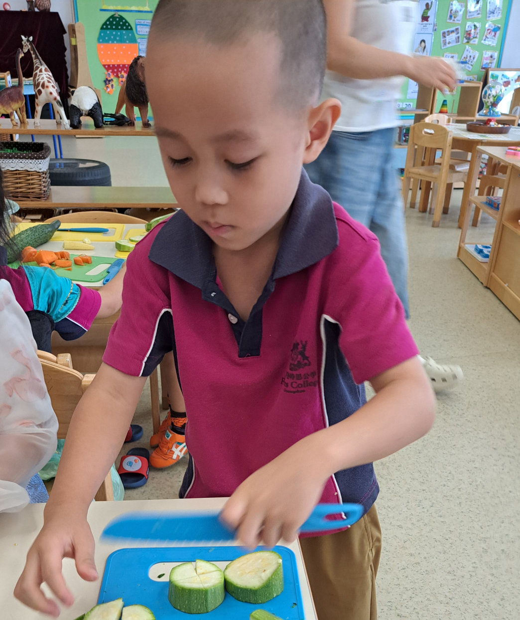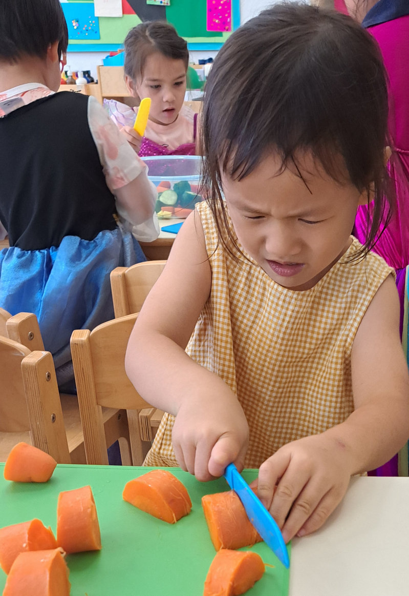 本周,中班的英语时光围绕着奇妙的字母“C”展开。我们与黄瓜、胡萝卜、玉米、卷心菜和西葫芦进行了一场亲密接触,用小手摸一摸、用小鼻子闻一闻,感受每种蔬菜独特的外形、香气和触感。在老师的指导下,孩子们小心翼翼地拿起工具,将蔬菜切成小块。在制作二分之一和四分之一的过程中,我们不仅认识了分数,更锻炼了灵巧的小手。