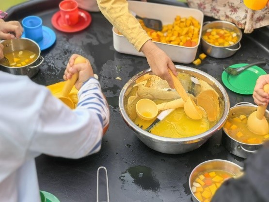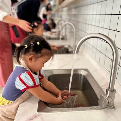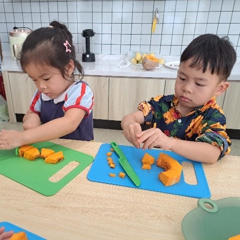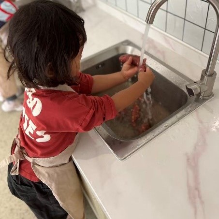 随后,EY3和EY4的孩子们与厨房工作人员默契配合,将这些新鲜蔬菜变成了创意十足的美味下午茶点心。