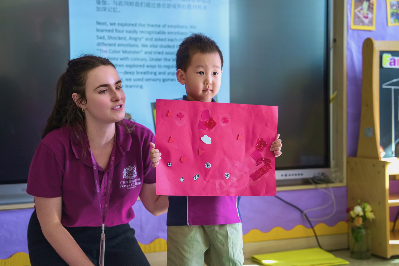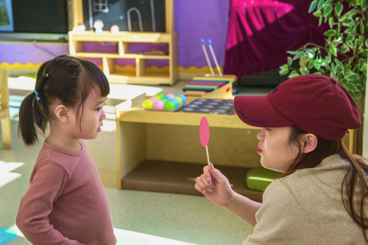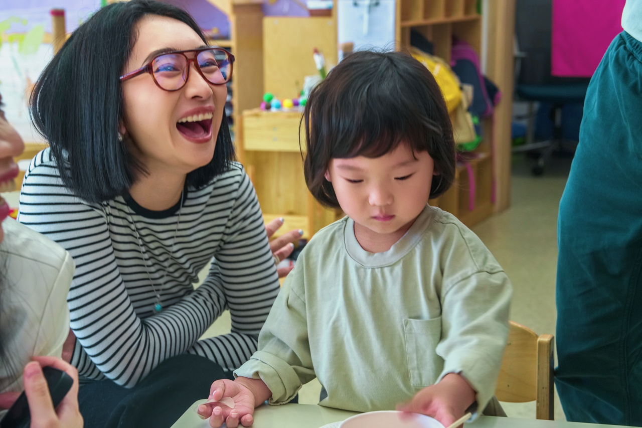 学习之旅惊喜不断,萌娃们大声喊出英文词汇,奶声奶气的甜蜜发音萌化全场;更有活力满满的游戏互动—“小蜜蜂”们灵敏地跳到家长手中颜色对应区域,再大声喊出颜色名称,在欢快跳跃中萌态十足。