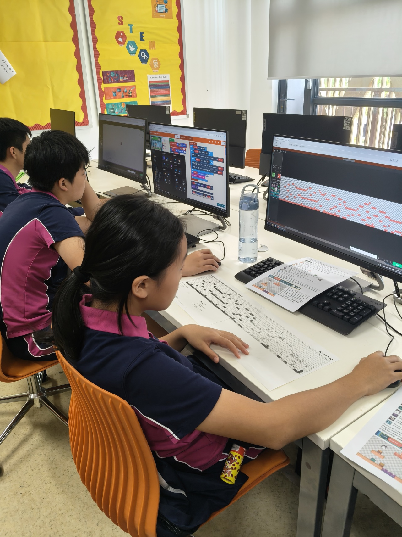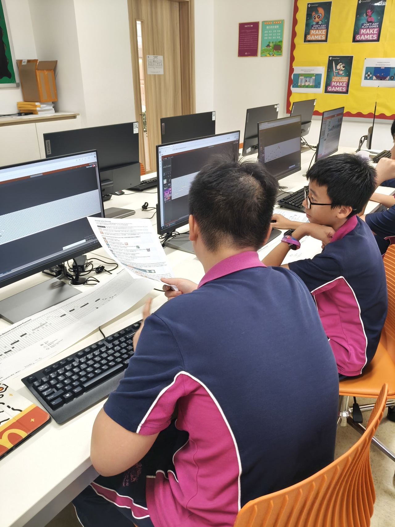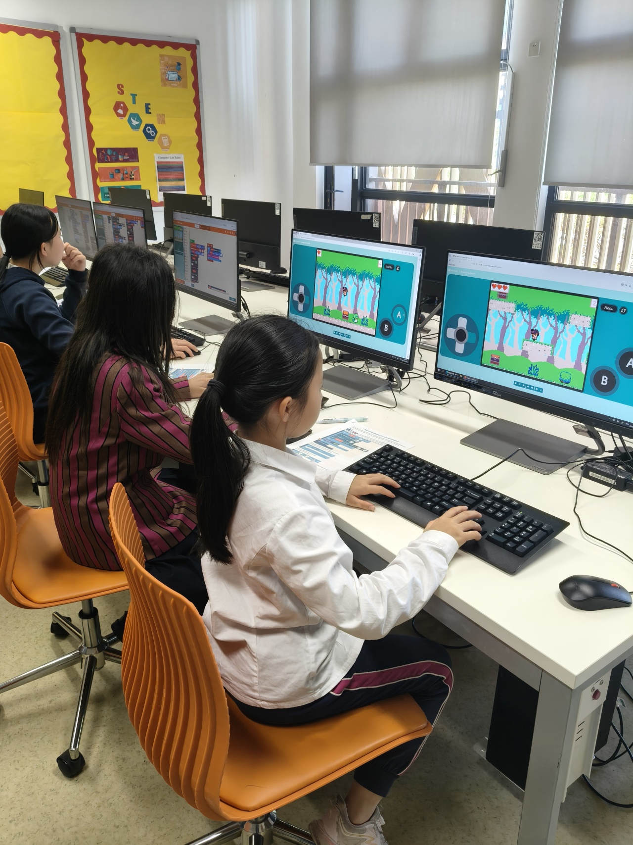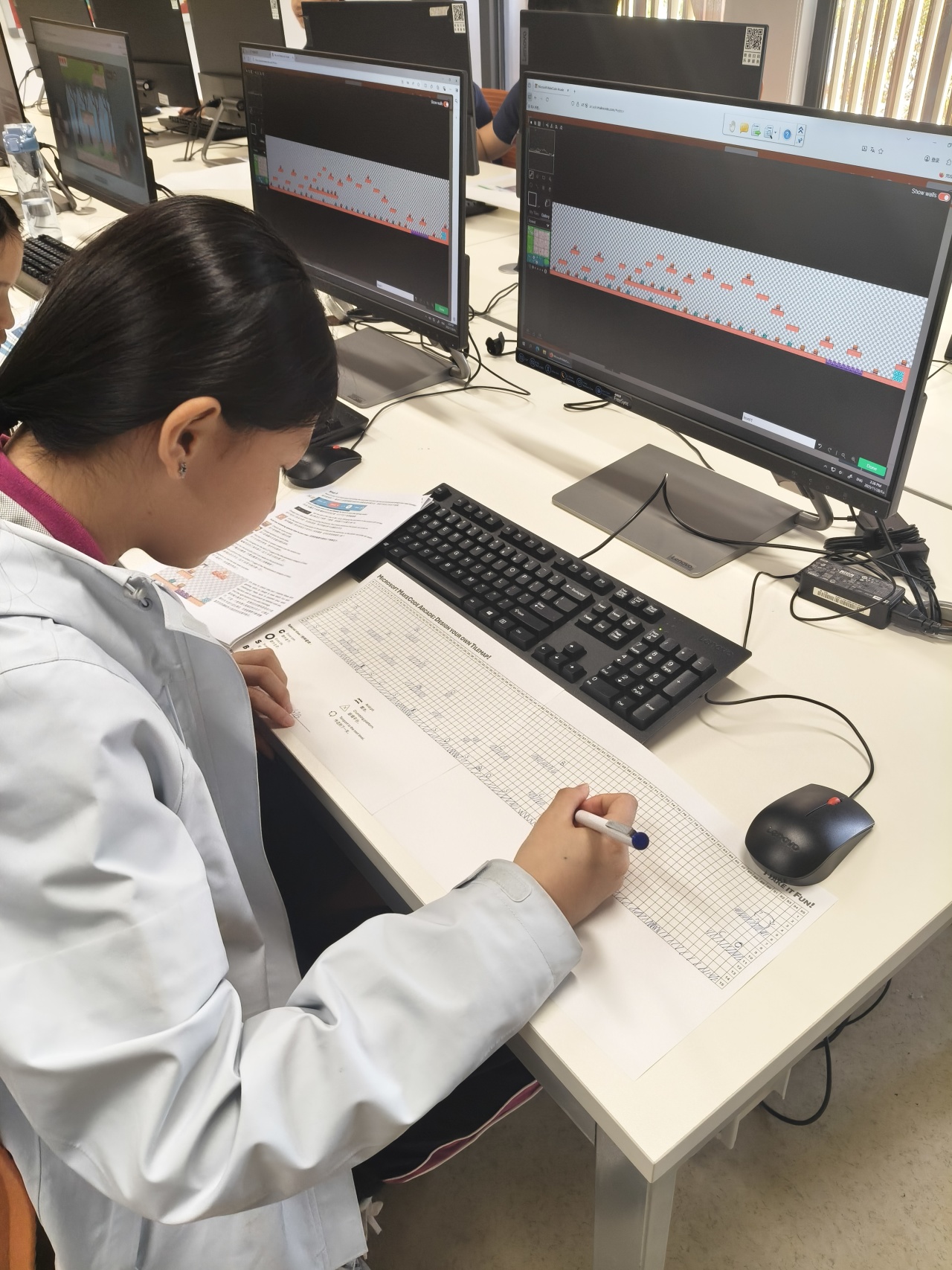他们学习旅程的亮点是从零开始设计自己的平台游戏关卡。学生们策略性地放置不同的平台块,在关卡中定位奖励和敌人,并仔细构建通往终点的路径。每一关都成为一个独特的谜题,反映出个人的创造力和解决问题的方法。