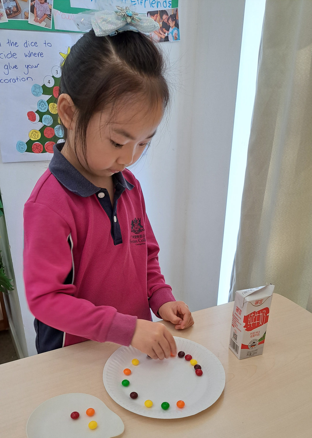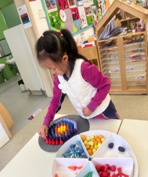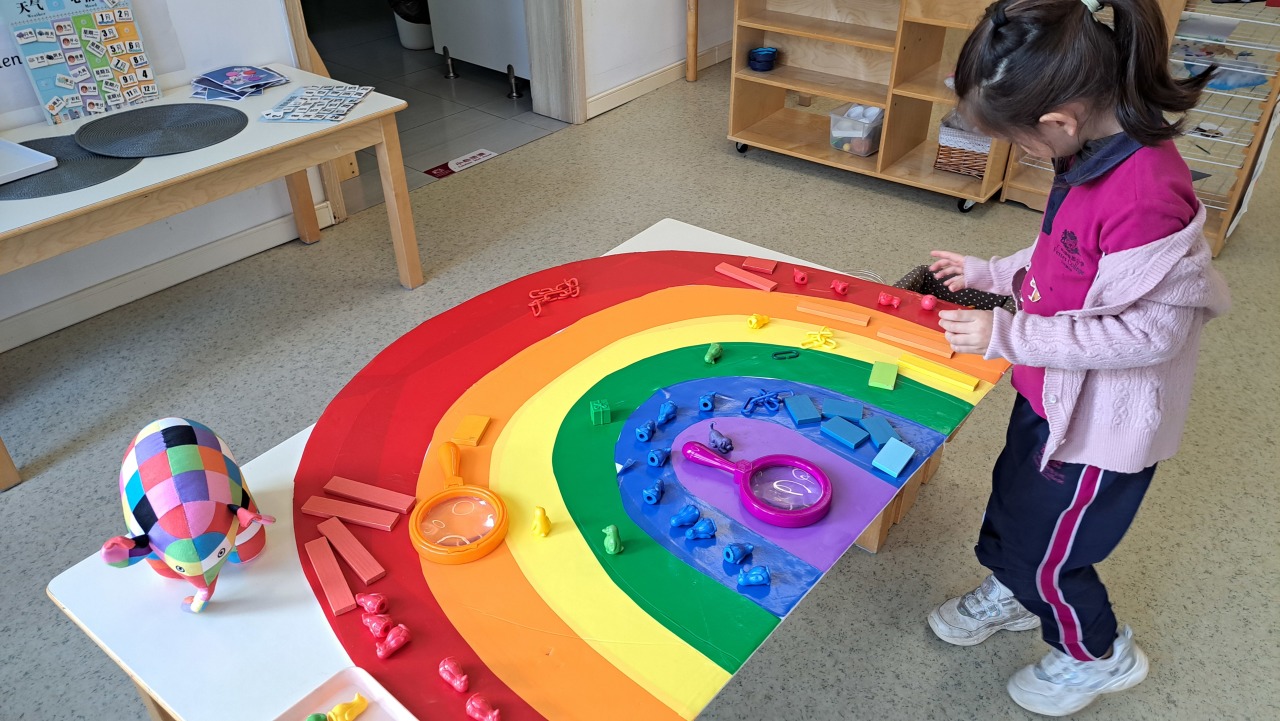 此外,孩子们能够指认彩虹的颜色,使用糖果等材料制作彩虹,并将物品按彩虹的颜色进行分类。