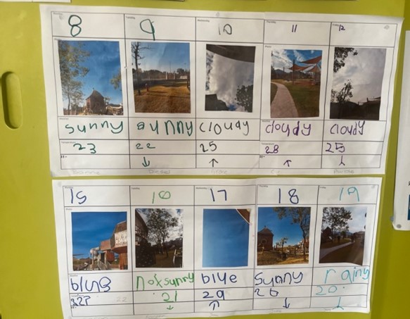 本周,中班围绕不同的天气现象展开学习。孩子们化身“天气预报员”,拍摄并记录每日天气状况,如“晴朗”、“多云”、“蓝天”等。还使用温度计测量气温,并与前一天的数据进行比较。